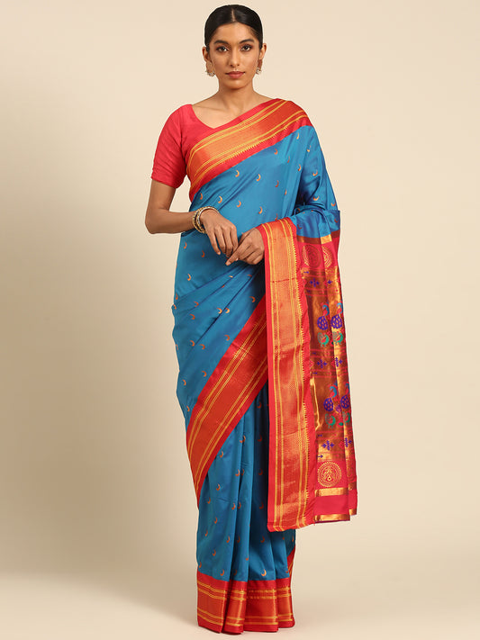 Chandrkala Chintamani Blue & Red Soft Silk Chandrakor Paithani Saree