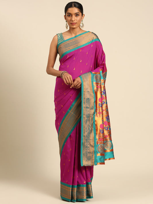 Chandrkala Magenta & Rama Soft Silk Chandrakor Paithani Saree