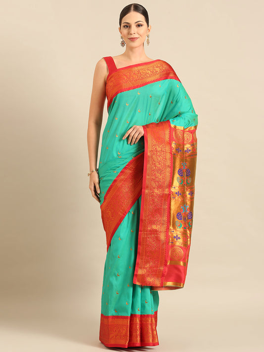 Chandani Sea Green & Red Soft Silk Chandrakor Paithani Saree