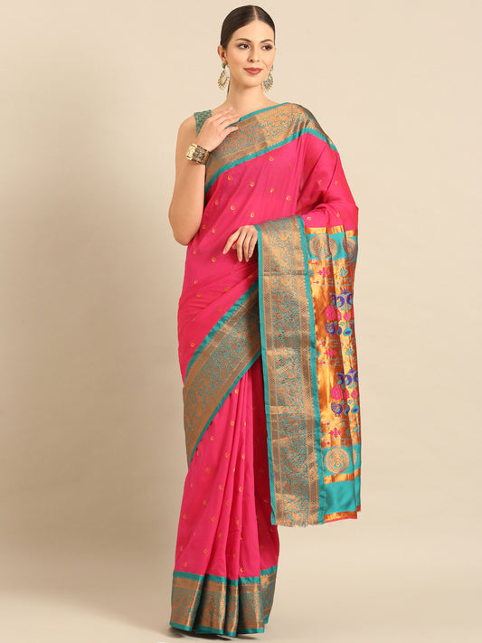 Chandrtara Hot Pink & Rama Soft Silk Chandrakor Paithani Saree