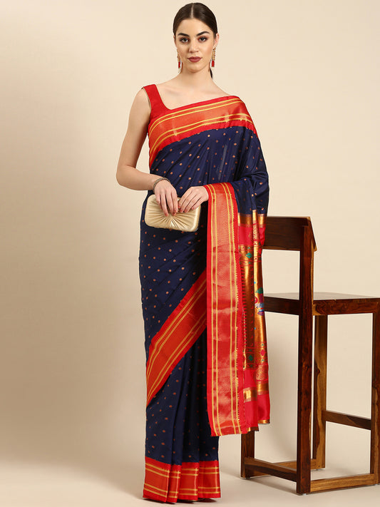 Rashmika Navy Blue & Red Soft Silk Double Pallu Paithani Saree