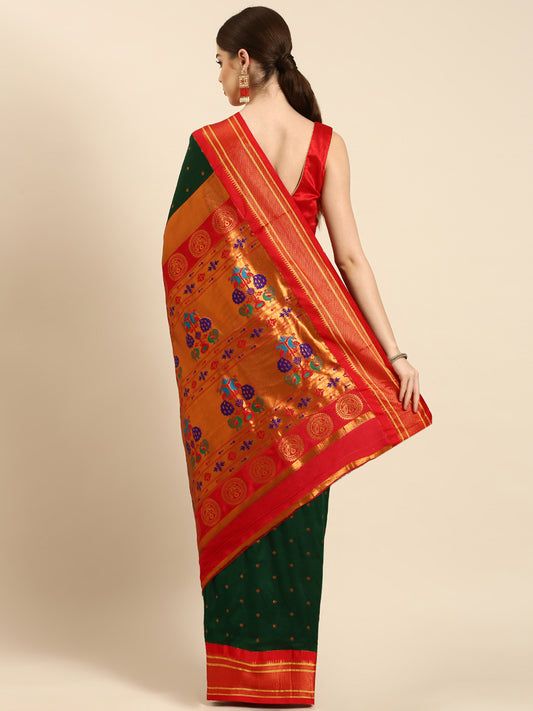 Usha Bottle Green & Red Semi Silk Maharani Paithani Saree