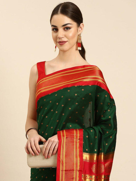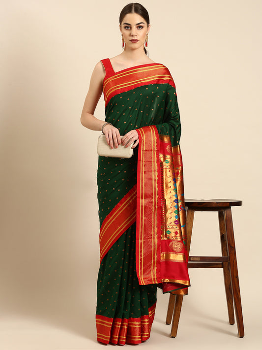 Rashmika Bottle Green & Red Soft Silk Double Pallu Paithani Saree