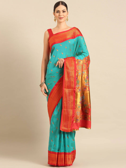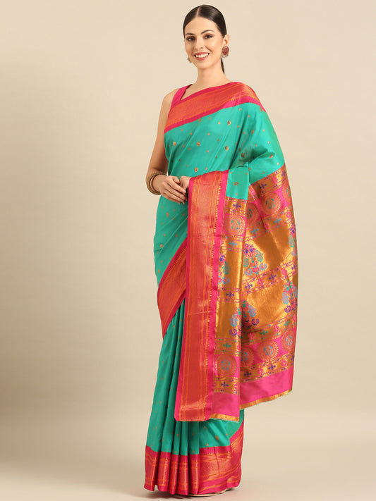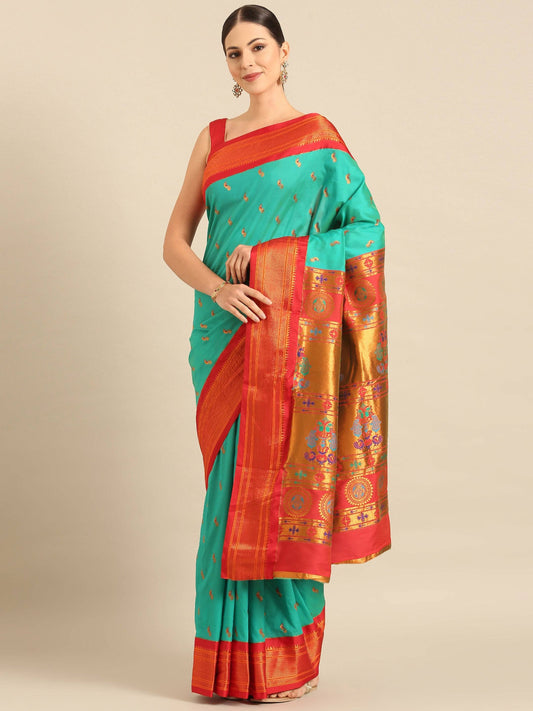 Umaa Sea Green & Red Soft Silk Maharani Paithani Saree