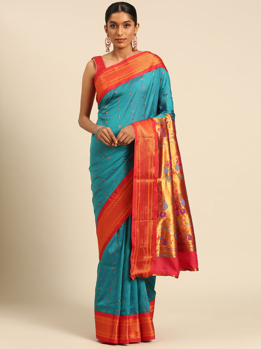 Suruchi Firozi & Red Semi Silk Muniya Paithani Saree