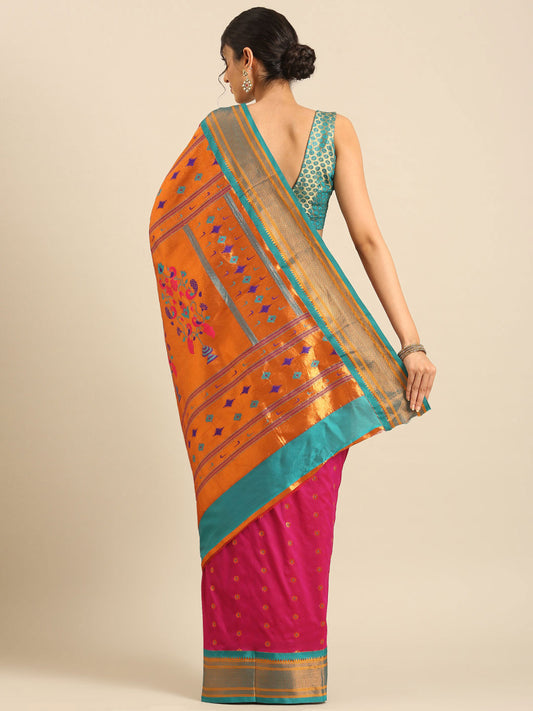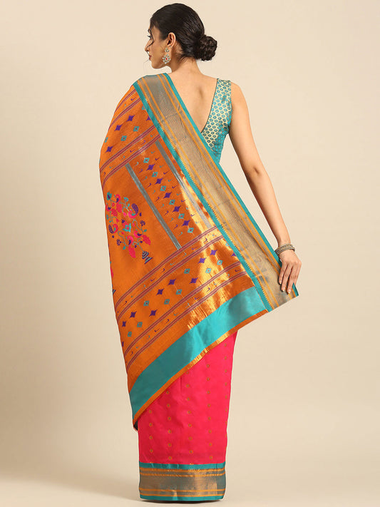 Muniya Paithani Saree Silk Blend with Zari Border and Peacock Pallu, Bridal, Festive ready, 5.5 Meter | Gopi Hot Pink & Rama