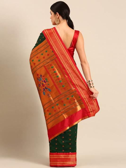 Amruta Bottle Green & Red Semi Silk Muniya Paithani Saree