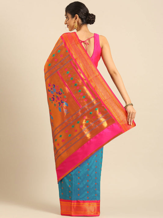 Muniya Paithani Saree Silk Blend with Zari Border and Peacock Pallu, Bridal, Festive ready, 5.5 Meter | Gopi Turquoise Blue & Pink