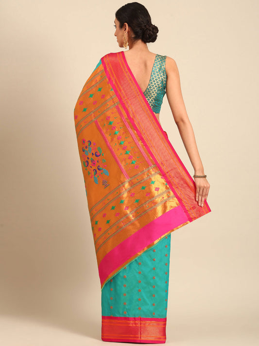 Amruta Mango Orange & Rama Semi Silk Muniya Paithani Saree
