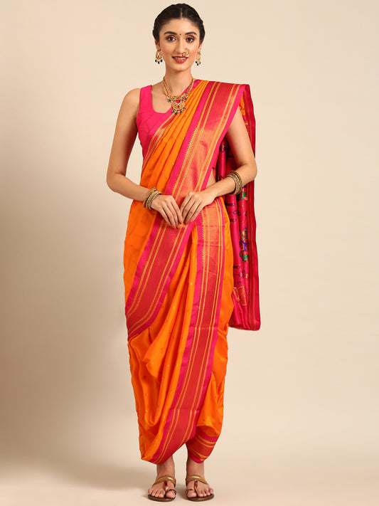 Swamini Mango Orange & Pink Soft Silk Maharani Nauvari Paithani Saree