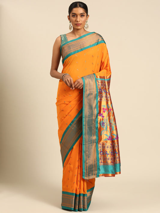 Myra Orange & Rama Soft Silk Kadiyal Maharani Paithani Saree