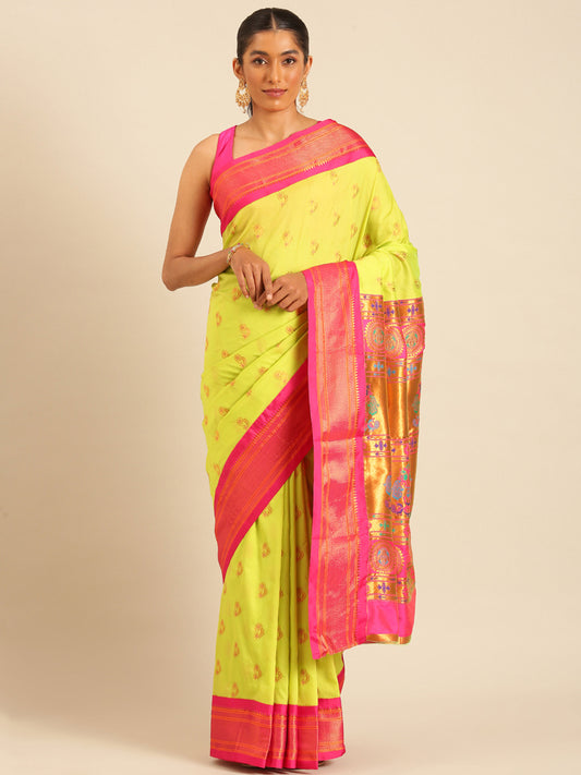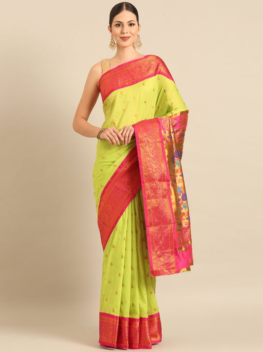 Chandrtara Parrot Green & Pink Soft Silk Chandrakor Paithani Saree