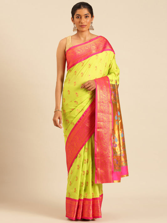 Myra Parrot Green & Pink Soft Silk Kadiyal Maharani Paithani Saree