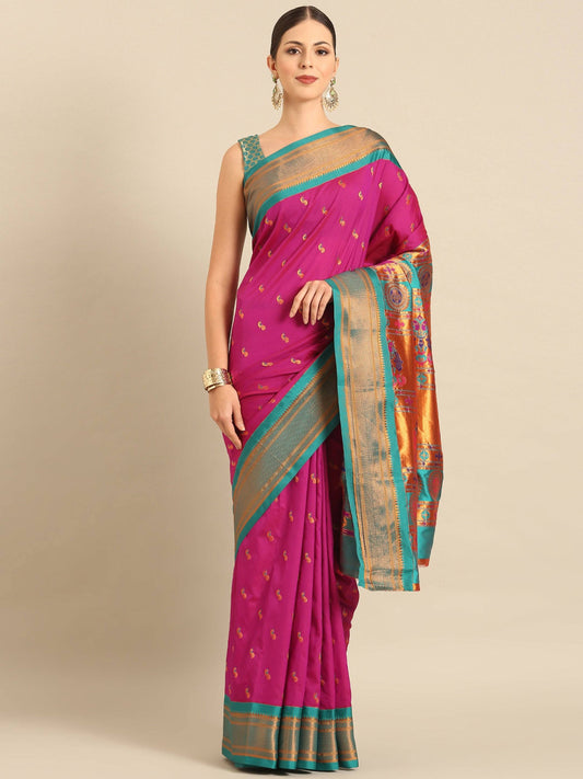 Chandrtara Magenta & Rama Soft Silk Chandrakor Paithani Saree