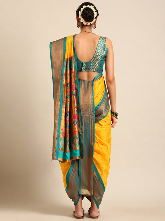 Sonkali Mustard & Rama Semi Silk Peshwai Nath Paithani Saree