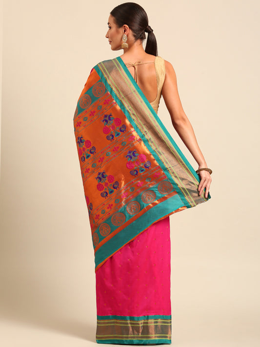 Sonkali Hot Pink & Rama Semi Silk Peshwai Nath Paithani Saree