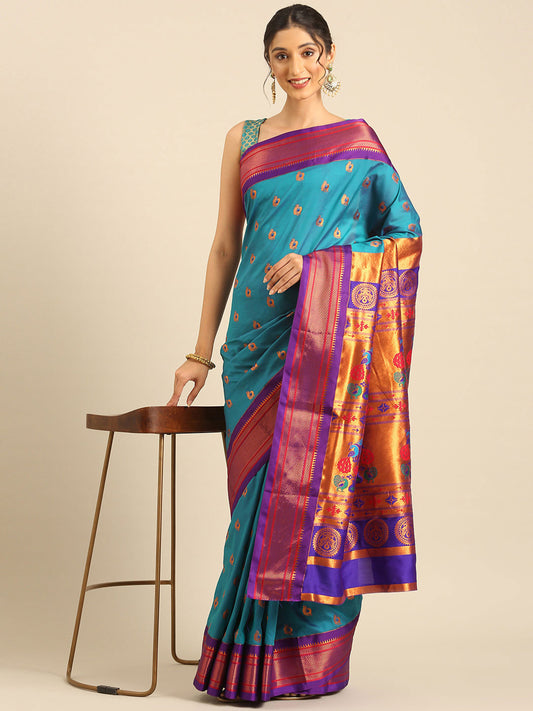 Usha Teal Blue & Violet Soft Silk Maharani Paithani Saree