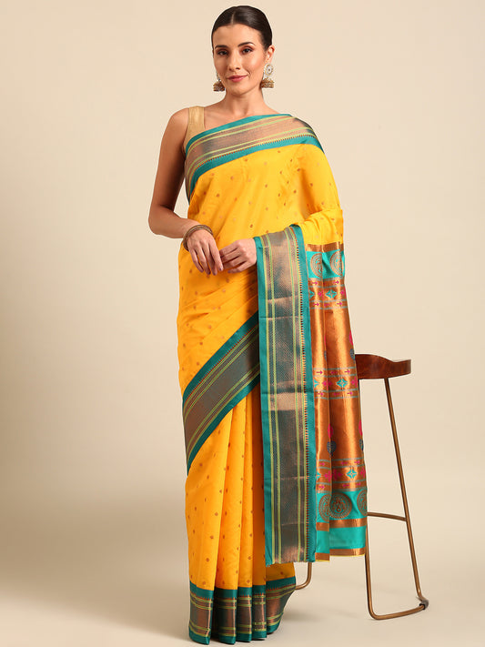 Mukta Haldi & Rama Soft Silk Kadiyal Maharani Paithani Saree