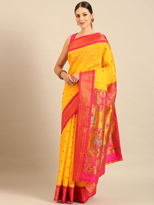 Mukta Haldi & Pink Soft Silk Kadiyal Maharani Paithani Saree