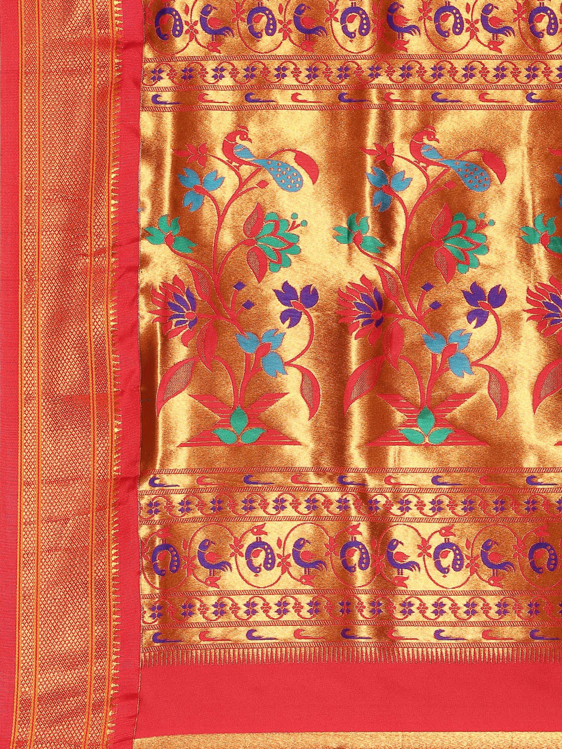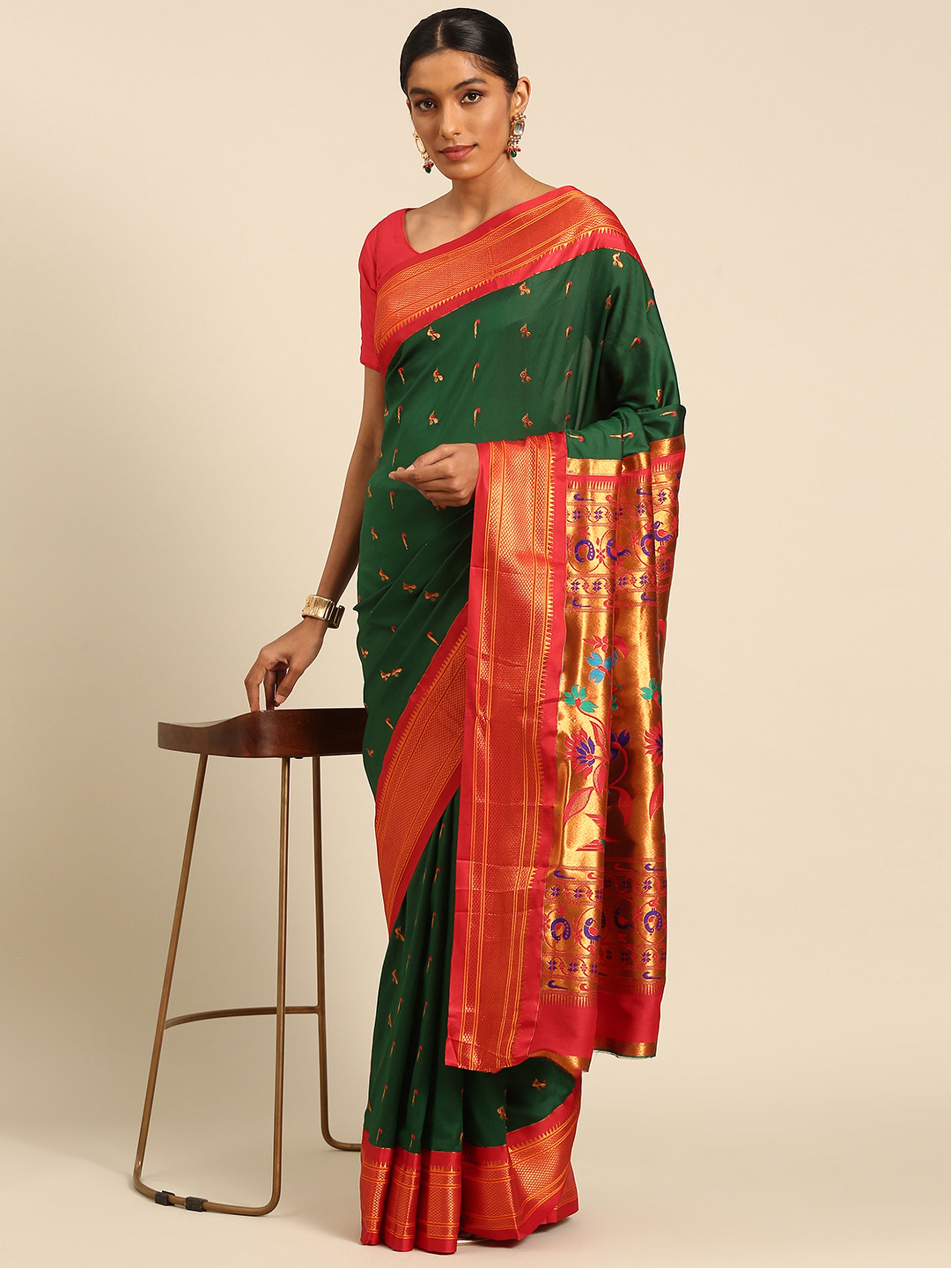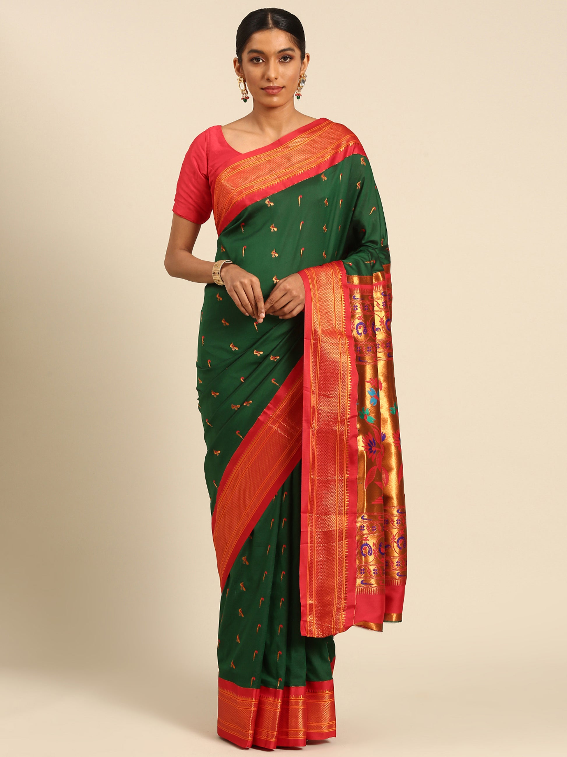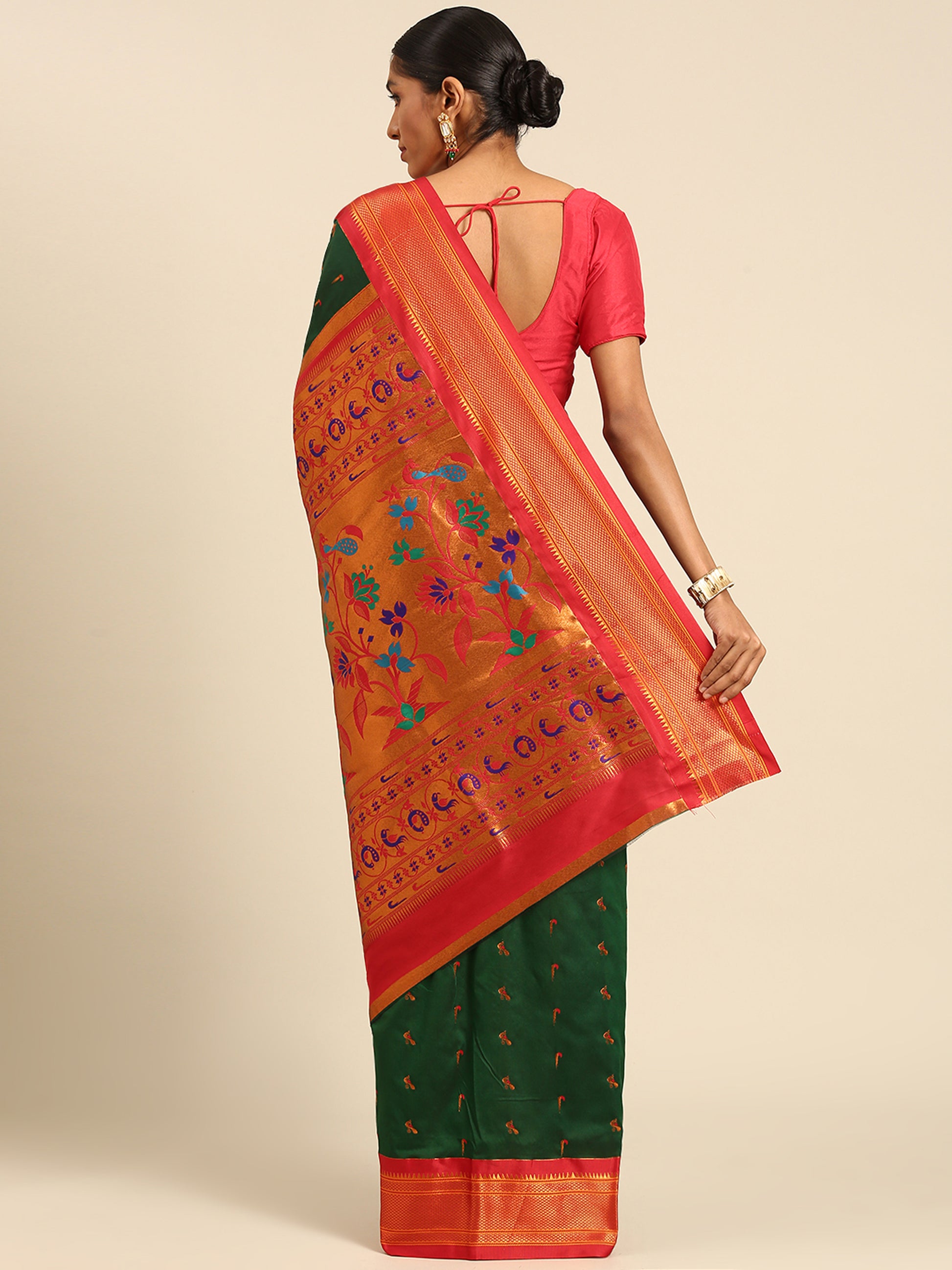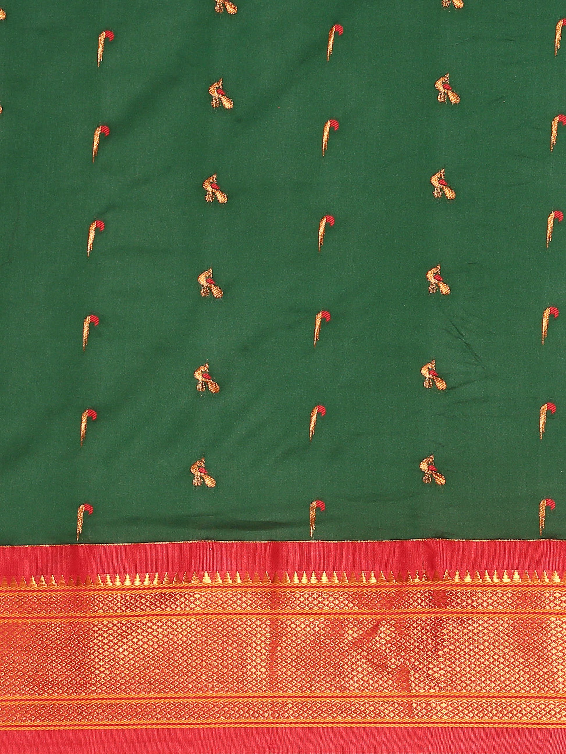 Aarushi Bottle Green & Red Soft Silk Muniya Paithani Saree