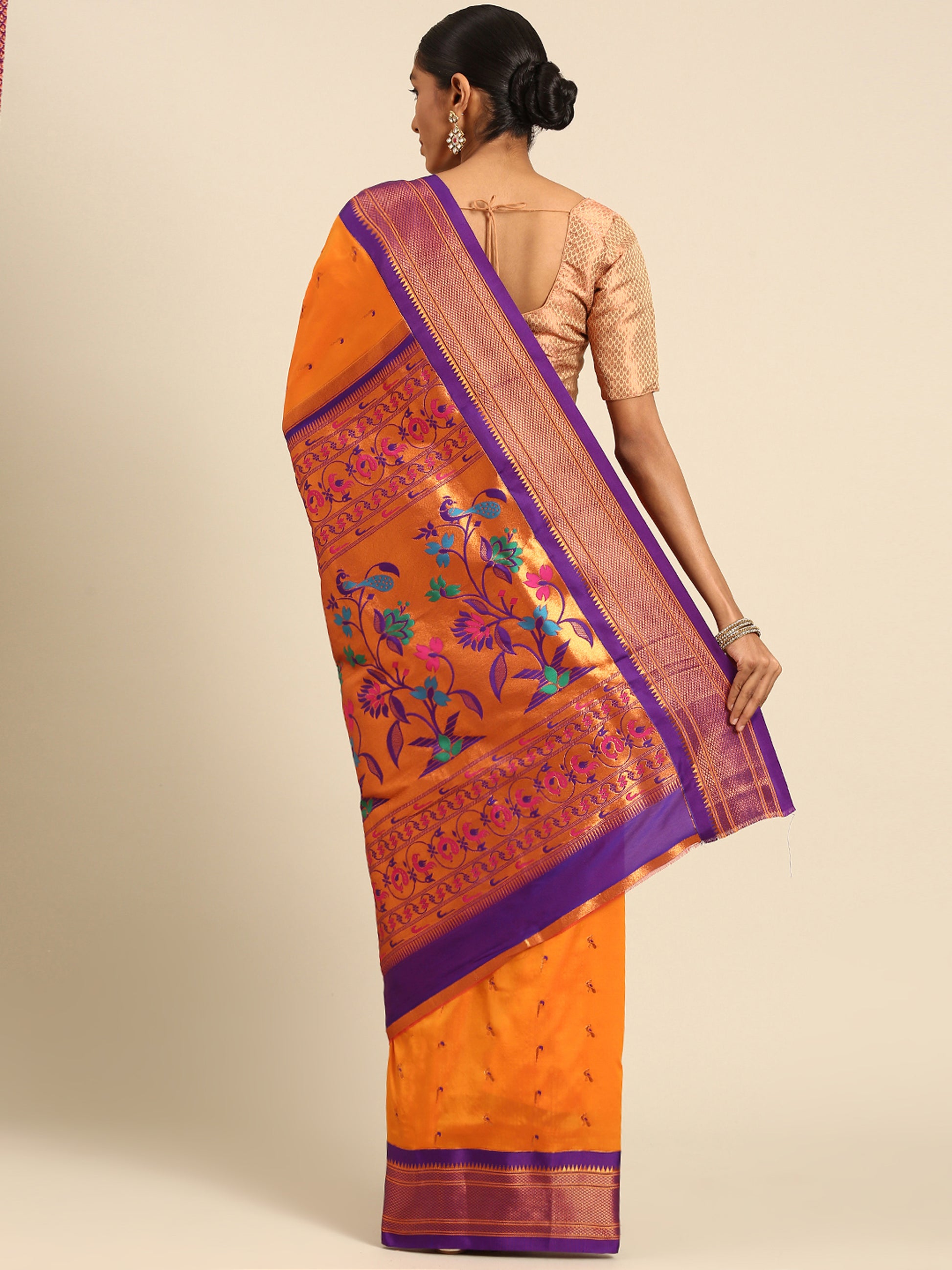 Aarushi Orange & Violet Soft Silk Muniya Paithani Saree