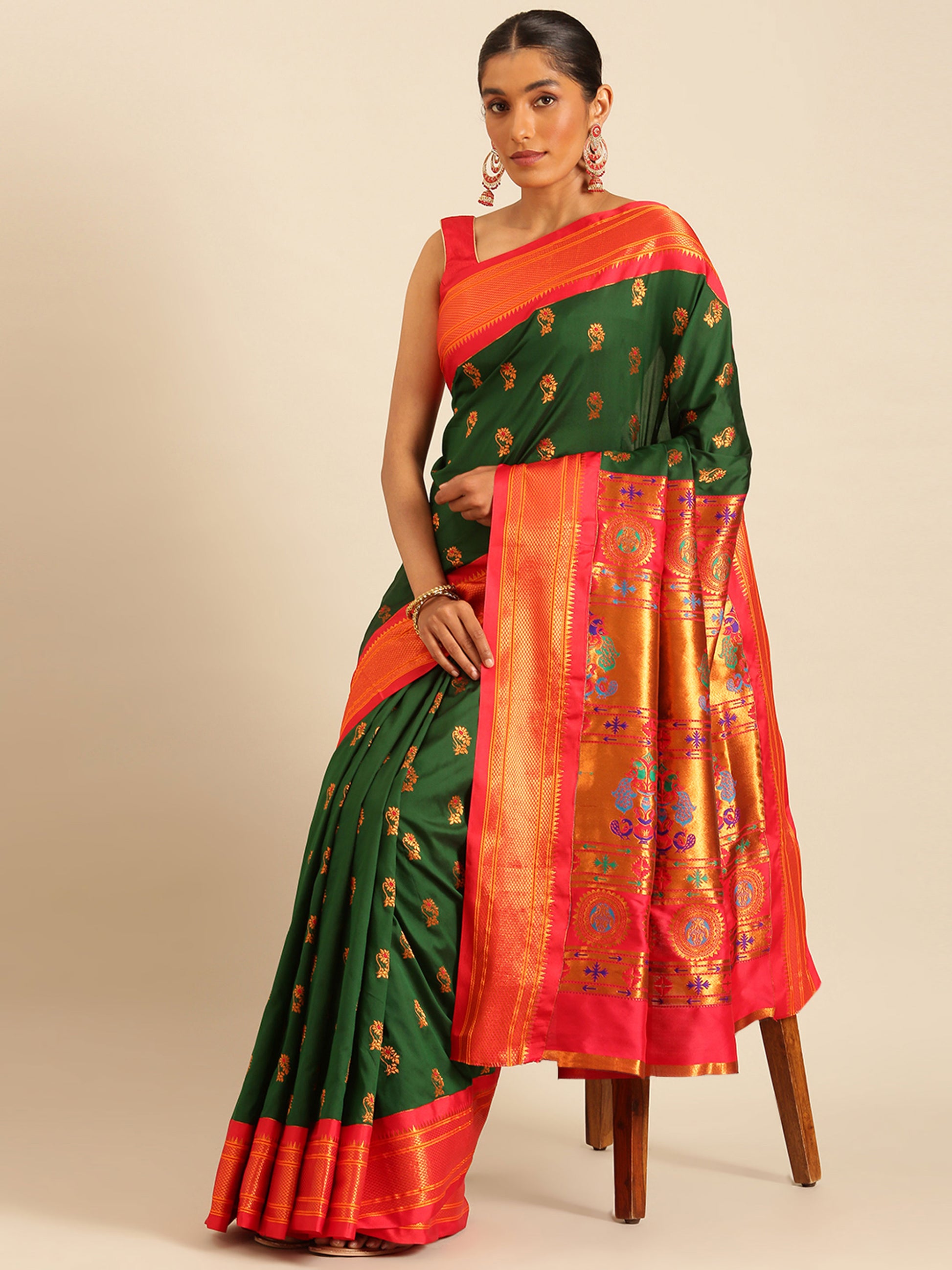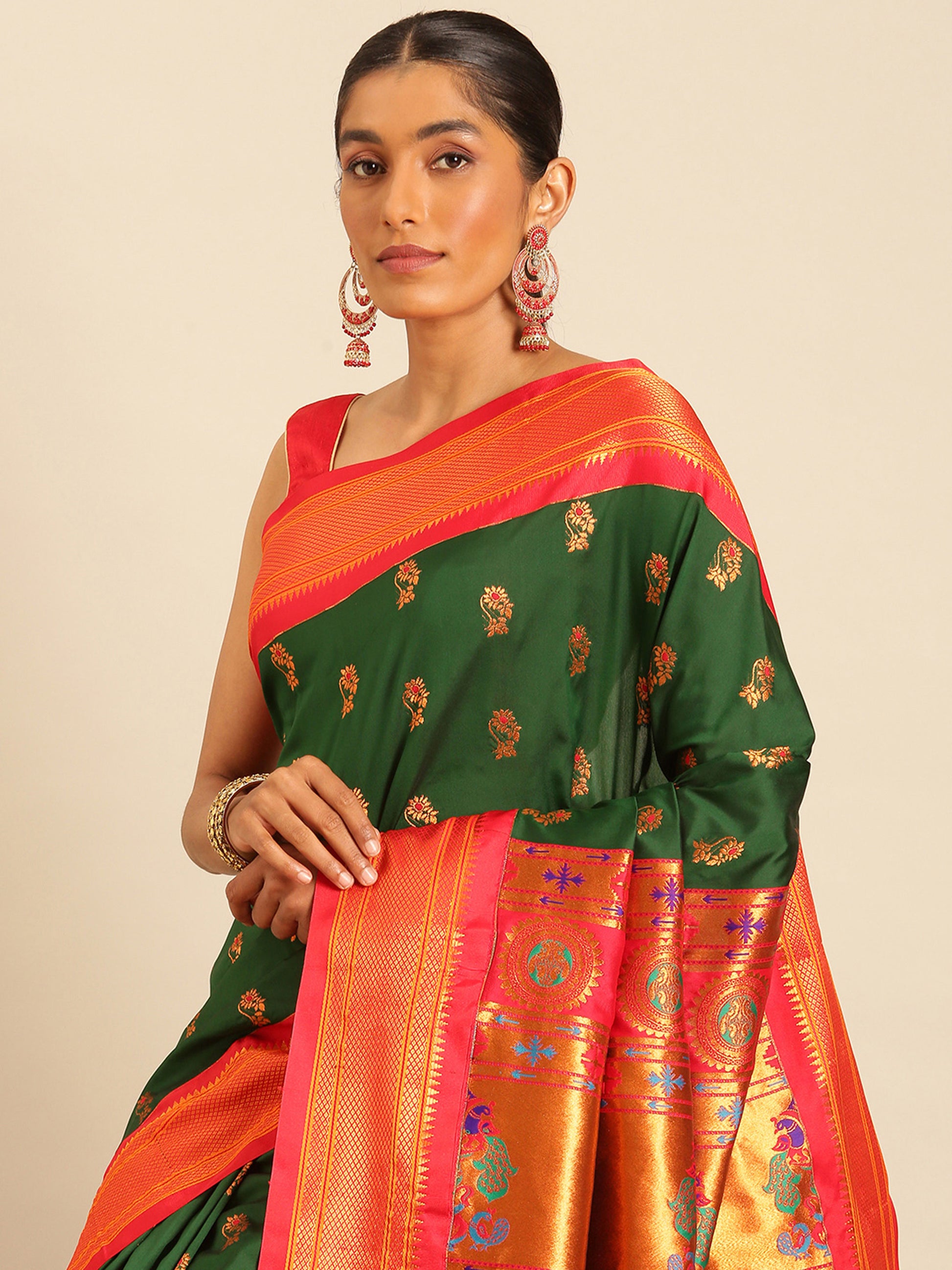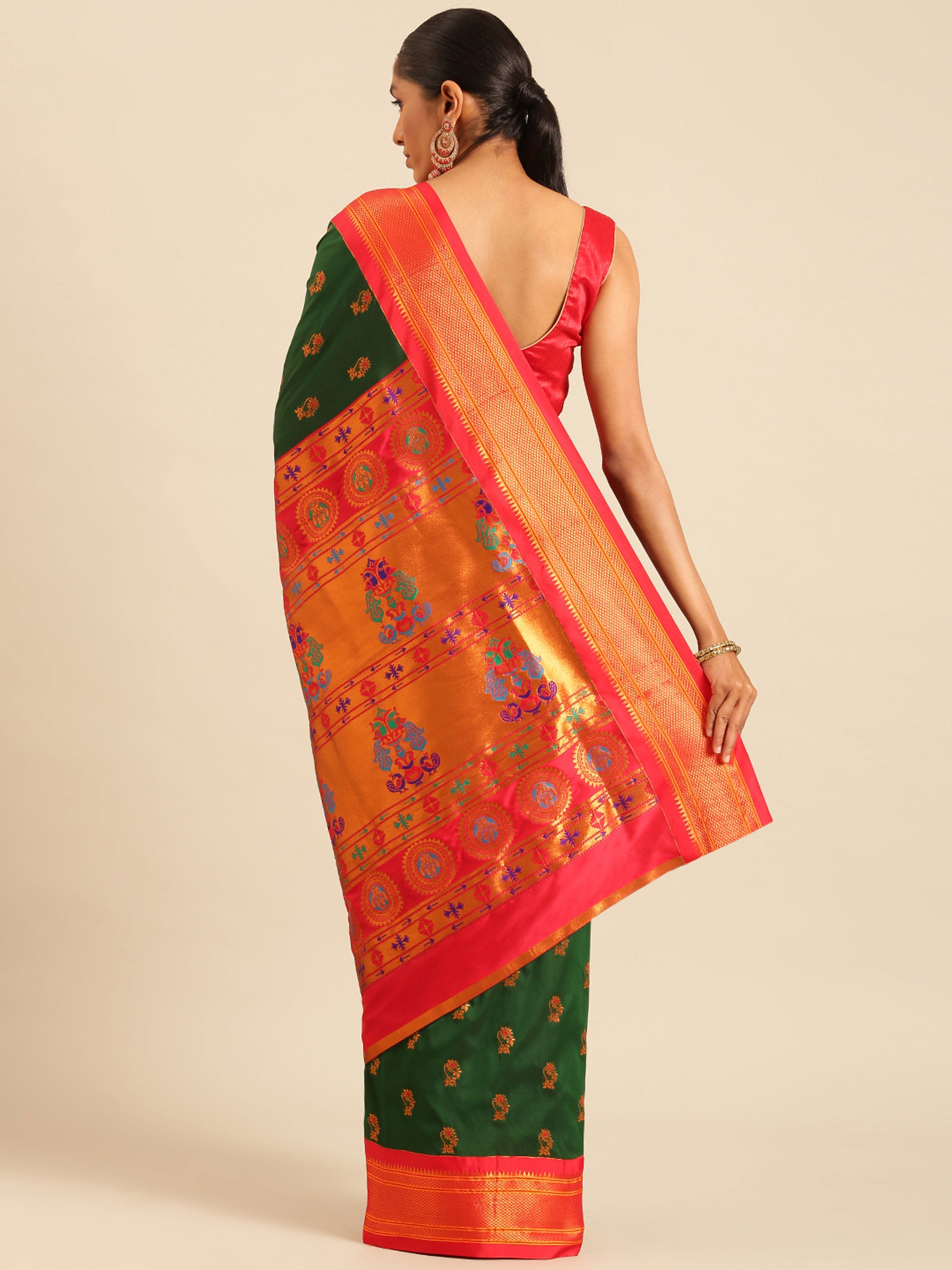 Ahilya Bottle Green & Red Soft Silk Peshwai Nath Paithani Saree
