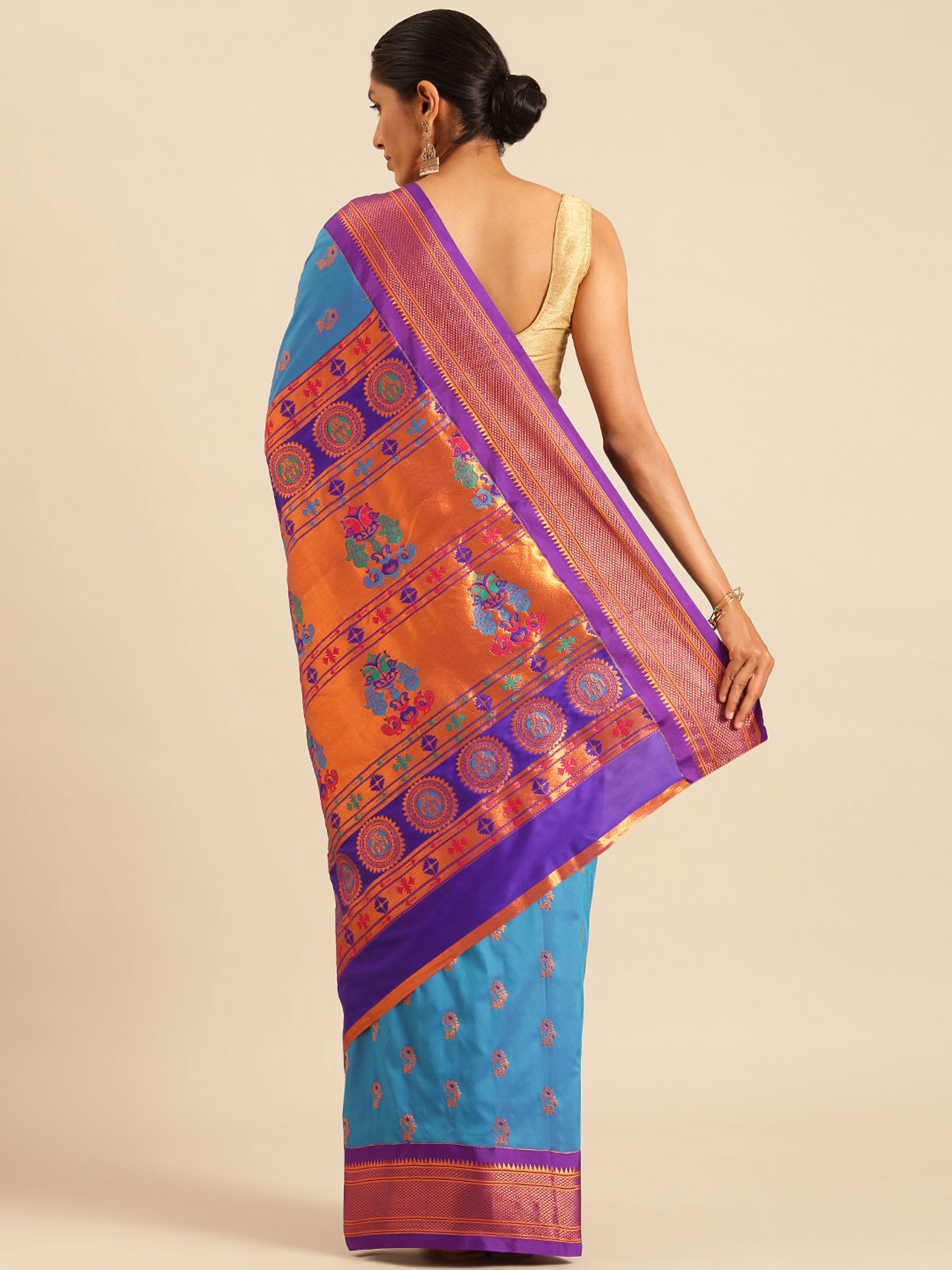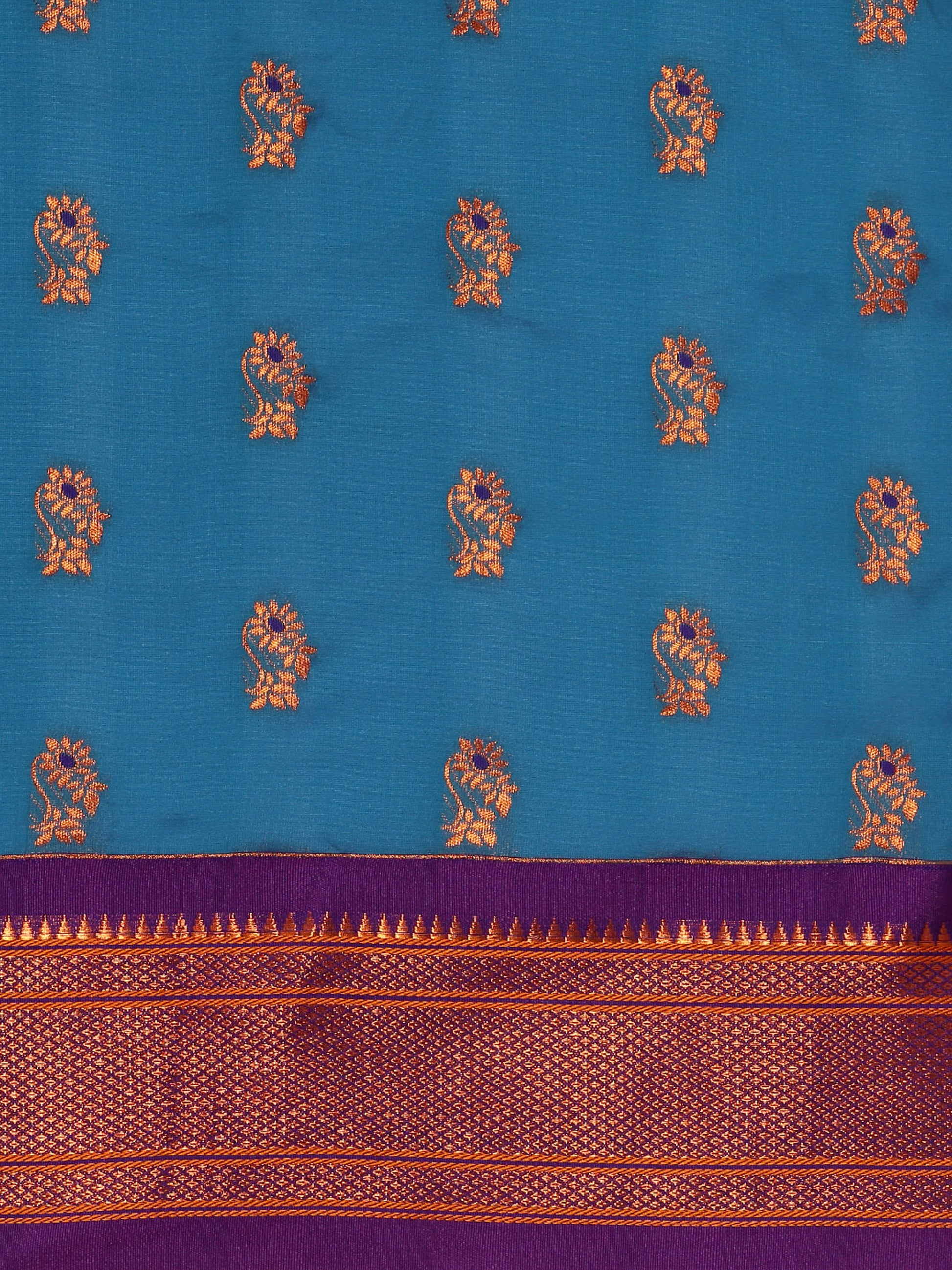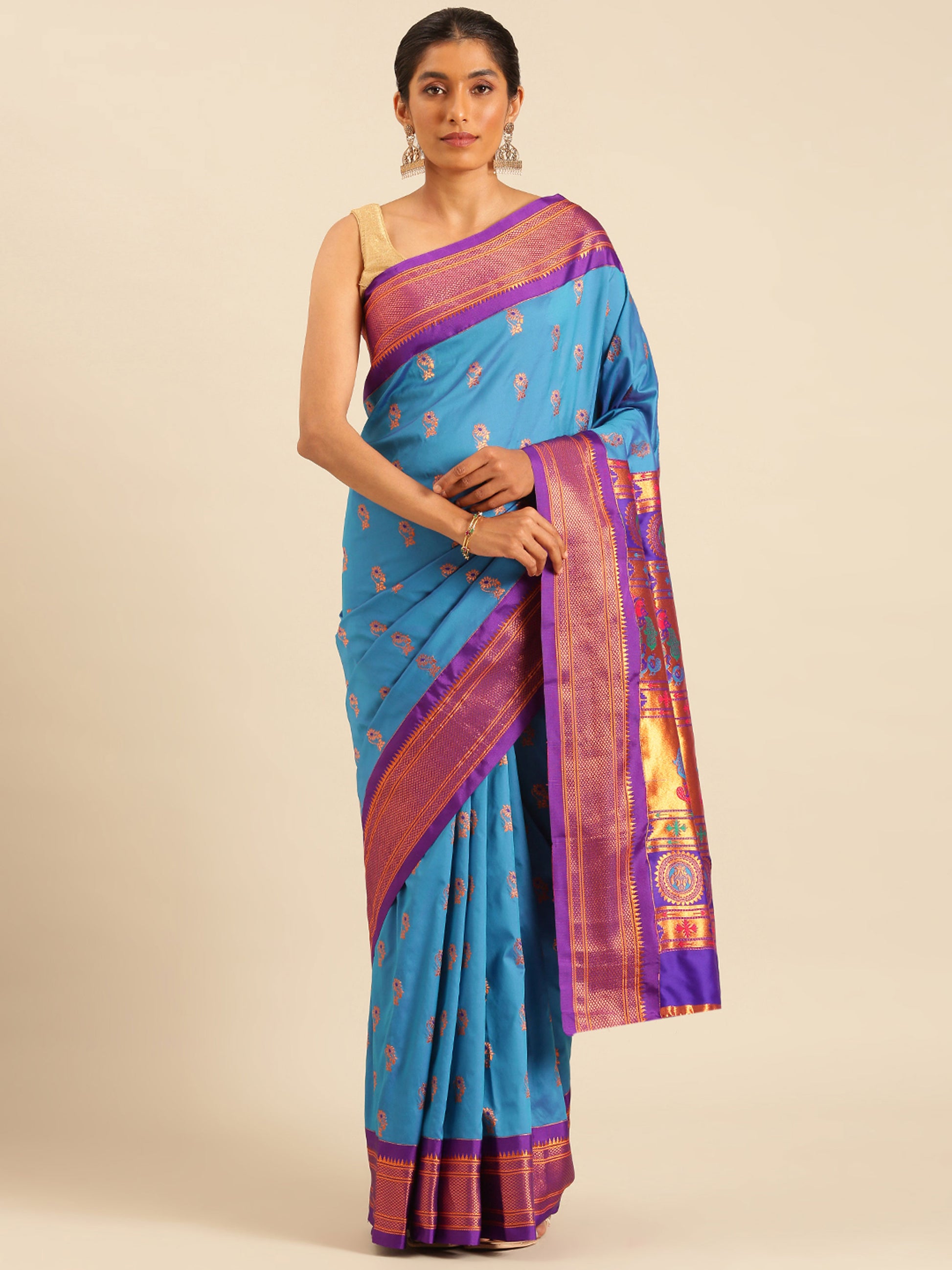 Explore The Collection Of Beautifully Designed Firozi & Violet Soft Silk Peshwai Nath Paithani Saree With Blouse Piece From Varkala Silk Sarees. Elevate Your Ethnic Wardrobe With The Exquisite Peshwai Nath Paithani Saree, A Timeless Masterpiece That Blends Tradition With Elegance. Crafted From Soft Silk Fabric With A Blend Of 70% Polyester And 30% Silk, This Saree Offers A Luxurious Drape And A Subtle Sheen, Perfect For Grand Occasions. Measuring 5.5 Meters With A 0.8-Meter Blouse Piece, It Features A Copper Zari Woven Intricate Checks Kadiyal Border That Exudes Grace. The Body Is Adorned With Copper Zari Peshwai Nath Meena Butti, While The Pallu Showcases Rich Copper Zari Woven Peacock Motifs, Symbolizing Prosperity. Enhanced With Zari And Multicolor Resham Silk Thread Embellishments, This Woven Kadiyal Paithani Saree Is Ideal For Weddings, Parties, And Festivals. Pair It With Traditional Jewelry For A Regal Look. Dry Clean For The First Wash, Followed By Gentle Hand Wash. Redefine Your Style With This Heritage-Rich Saree, A Perfect Blend Of Culture And Sophistication.