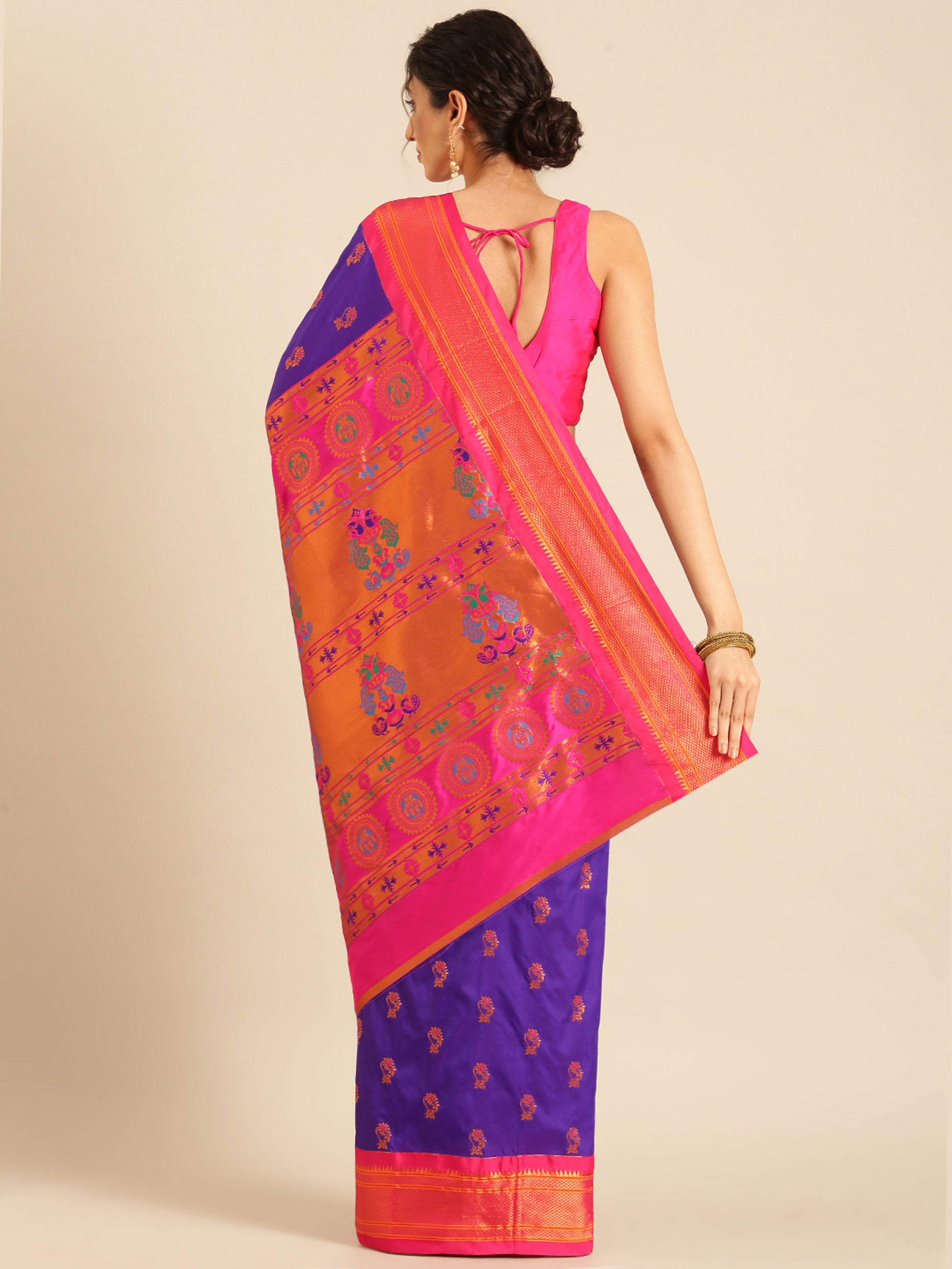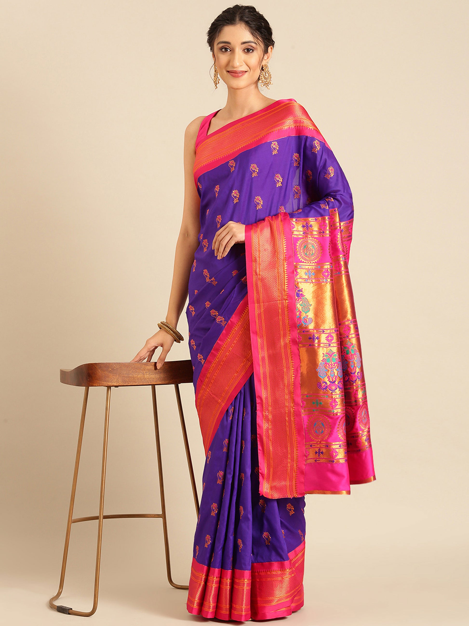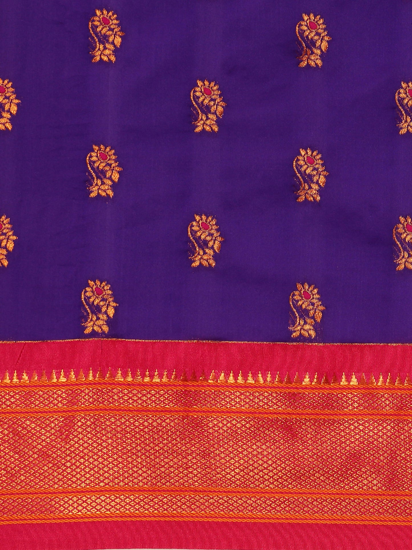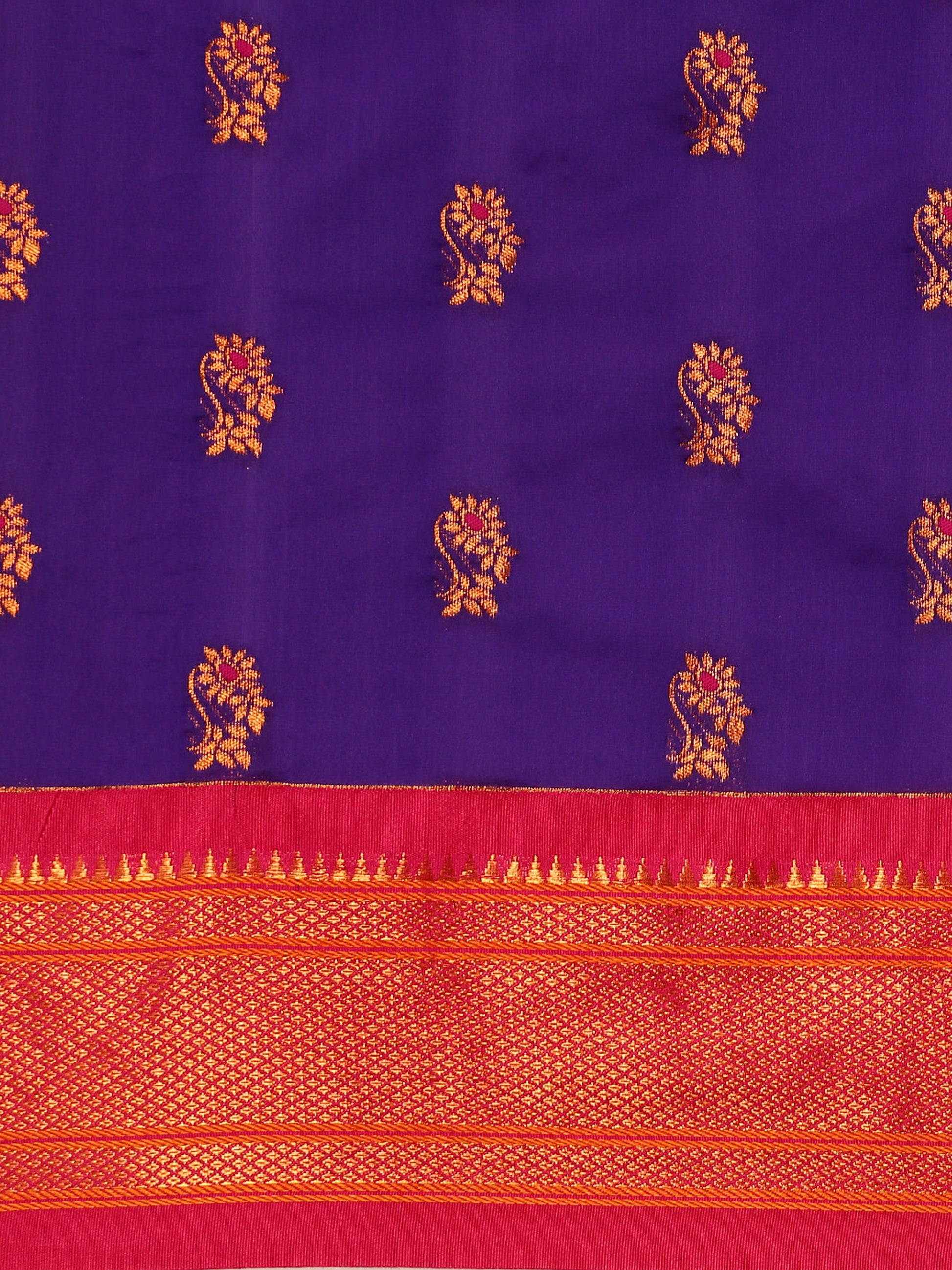 Explore The Collection Of Beautifully Designed Indigo Blue & Pink Soft Silk Peshwai Nath Paithani Saree With Blouse Piece From Varkala Silk Sarees. Elevate Your Ethnic Wardrobe With The Exquisite Peshwai Nath Paithani Saree, A Timeless Masterpiece That Blends Tradition With Elegance. Crafted From Soft Silk Fabric With A Blend Of 70% Polyester And 30% Silk, This Saree Offers A Luxurious Drape And A Subtle Sheen, Perfect For Grand Occasions. Measuring 5.5 Meters With A 0.8-Meter Blouse Piece, It Features A Copper Zari Woven Intricate Checks Kadiyal Border That Exudes Grace. The Body Is Adorned With Copper Zari Peshwai Nath Meena Butti, While The Pallu Showcases Rich Copper Zari Woven Peacock Motifs, Symbolizing Prosperity. Enhanced With Zari And Multicolor Resham Silk Thread Embellishments, This Woven Kadiyal Paithani Saree Is Ideal For Weddings, Parties, And Festivals. Pair It With Traditional Jewelry For A Regal Look. Dry Clean For The First Wash, Followed By Gentle Hand Wash. Pinkefine Your Style With This Heritage-Rich Saree, A Perfect Blend Of Culture And Sophistication.