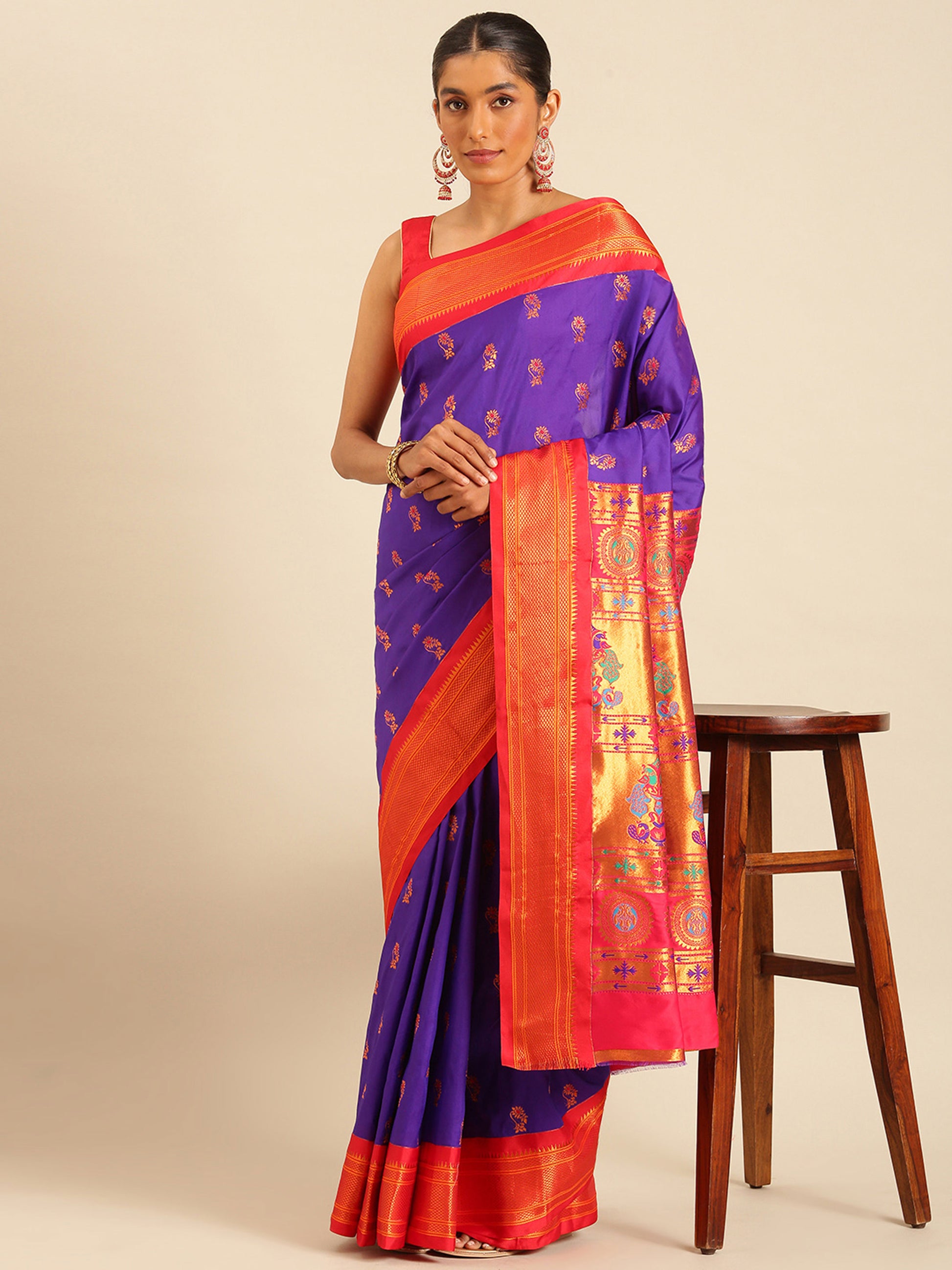 Explore The Collection Of Beautifully Designed Indigo Blue & Red Soft Silk Peshwai Nath Paithani Saree With Blouse Piece From Varkala Silk Sarees. Elevate Your Ethnic Wardrobe With The Exquisite Peshwai Nath Paithani Saree, A Timeless Masterpiece That Blends Tradition With Elegance. Crafted From Soft Silk Fabric With A Blend Of 70% Polyester And 30% Silk, This Saree Offers A Luxurious Drape And A Subtle Sheen, Perfect For Grand Occasions. Measuring 5.5 Meters With A 0.8-Meter Blouse Piece, It Features A Copper Zari Woven Intricate Checks Kadiyal Border That Exudes Grace. The Body Is Adorned With Copper Zari Peshwai Nath Meena Butti, While The Pallu Showcases Rich Copper Zari Woven Peacock Motifs, Symbolizing Prosperity. Enhanced With Zari And Multicolor Resham Silk Thread Embellishments, This Woven Kadiyal Paithani Saree Is Ideal For Weddings, Parties, And Festivals. Pair It With Traditional Jewelry For A Regal Look. Dry Clean For The First Wash, Followed By Gentle Hand Wash. Redefine Your Style With This Heritage-Rich Saree, A Perfect Blend Of Culture And Sophistication.