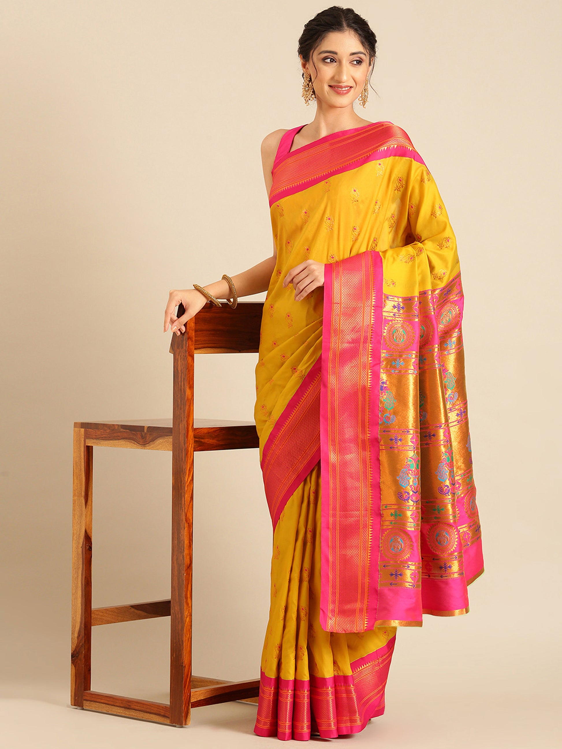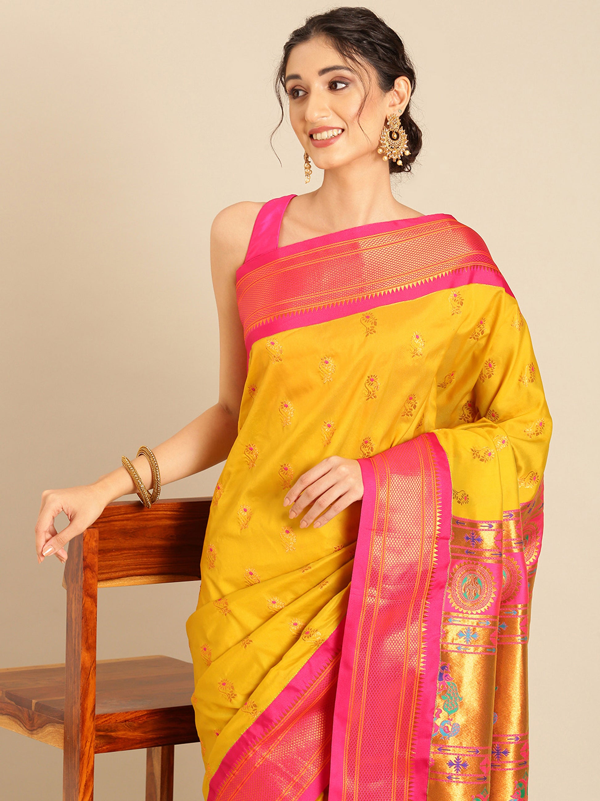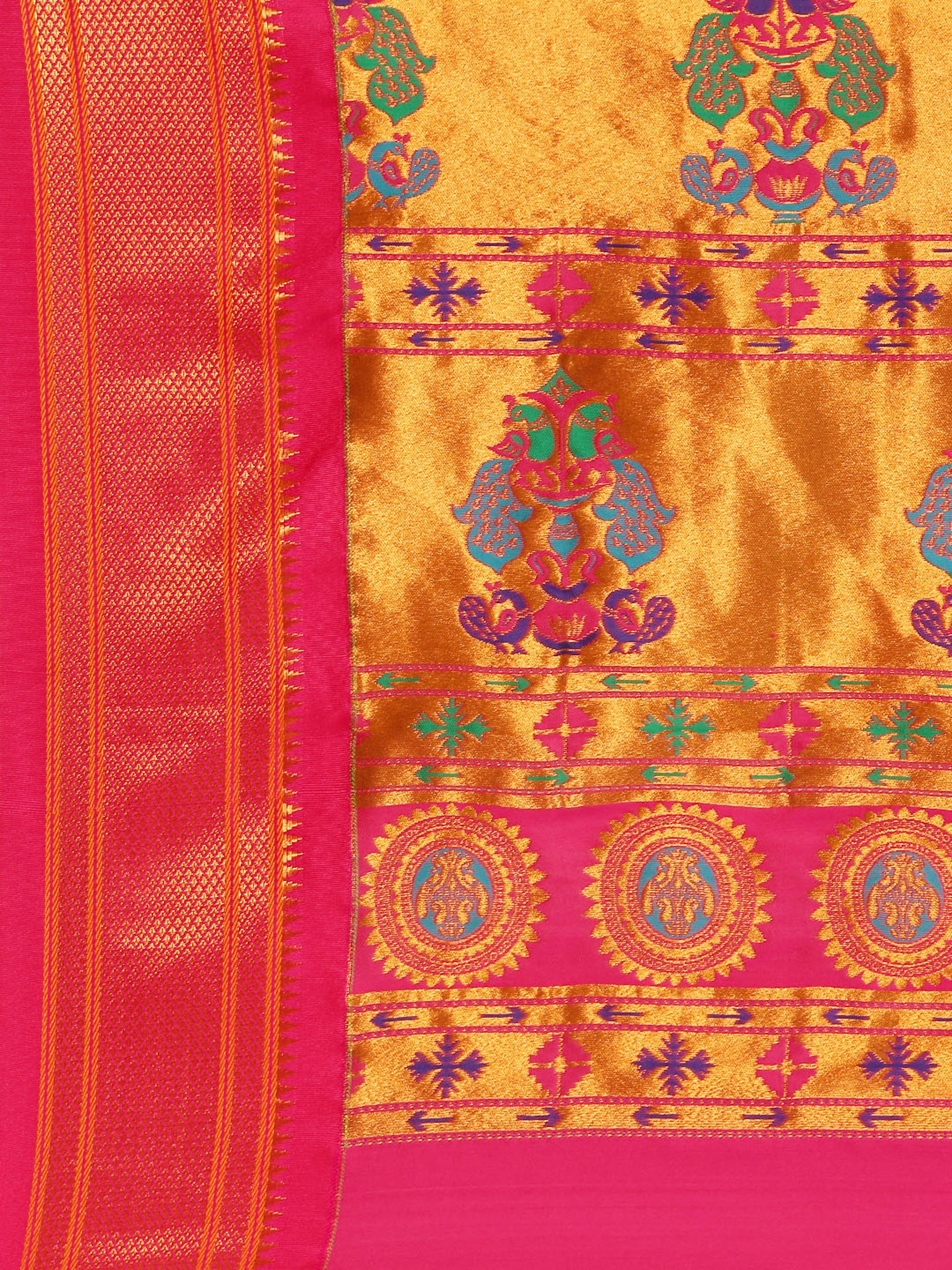 Ahilya Mustard & Pink Soft Silk Peshwai Nath Paithani Saree