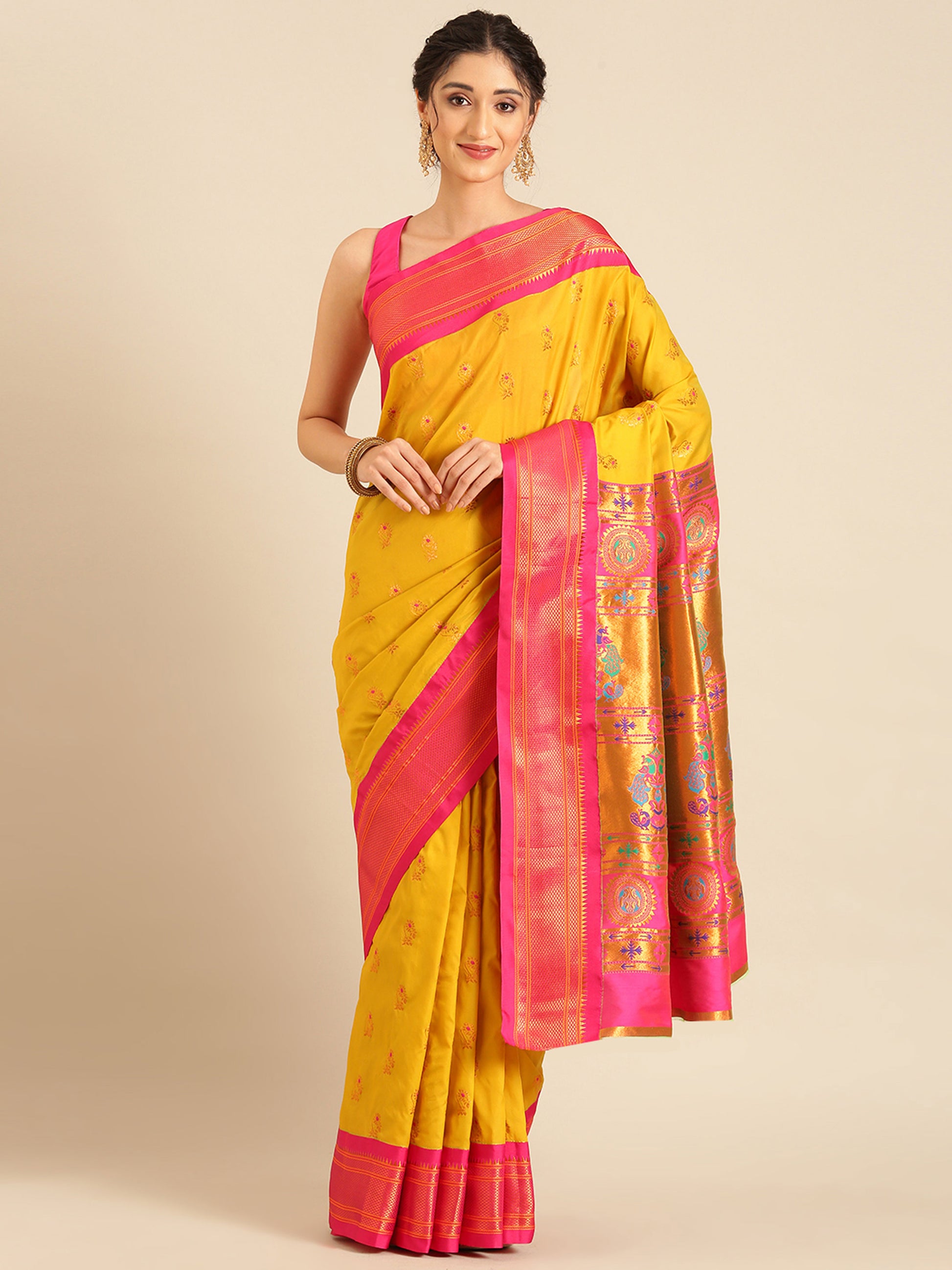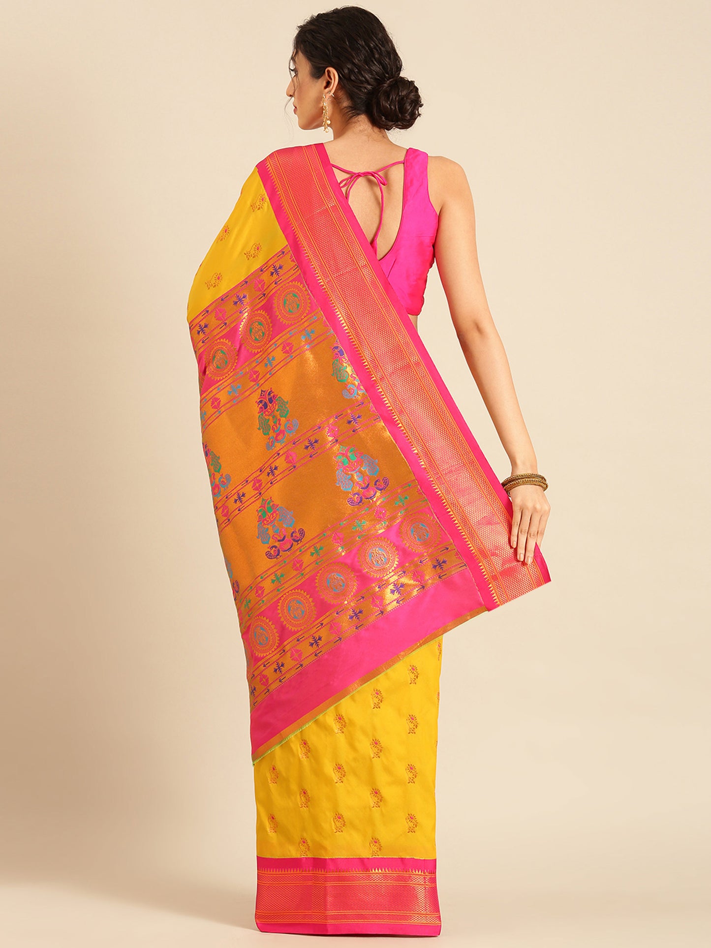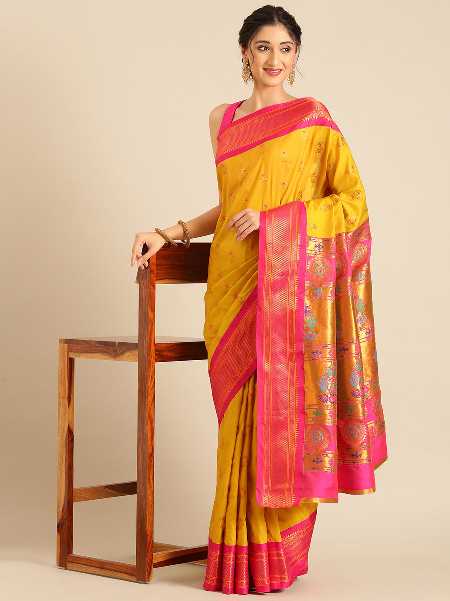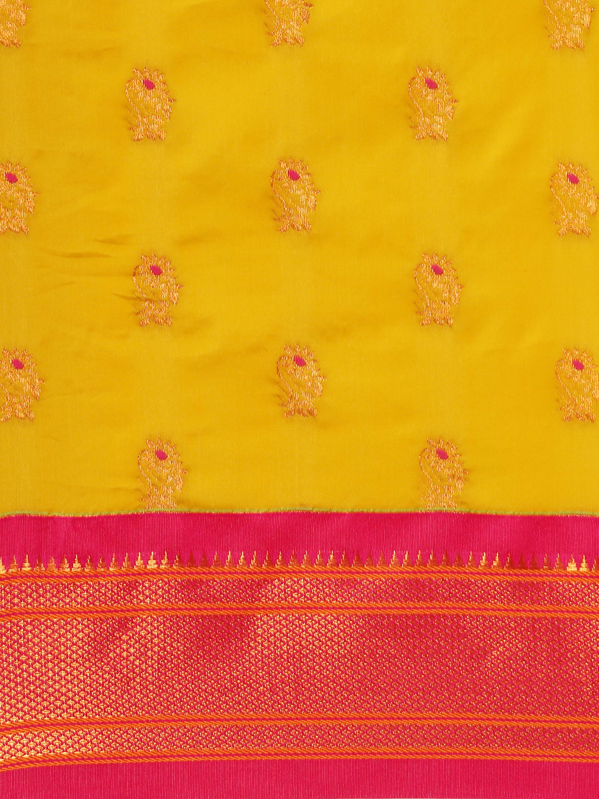 Ahilya Mustard & Pink Soft Silk Peshwai Nath Paithani Saree