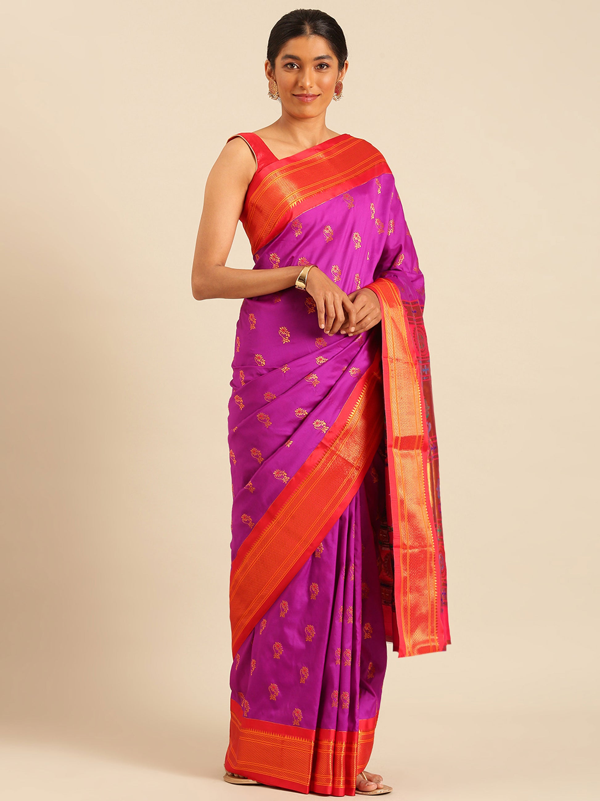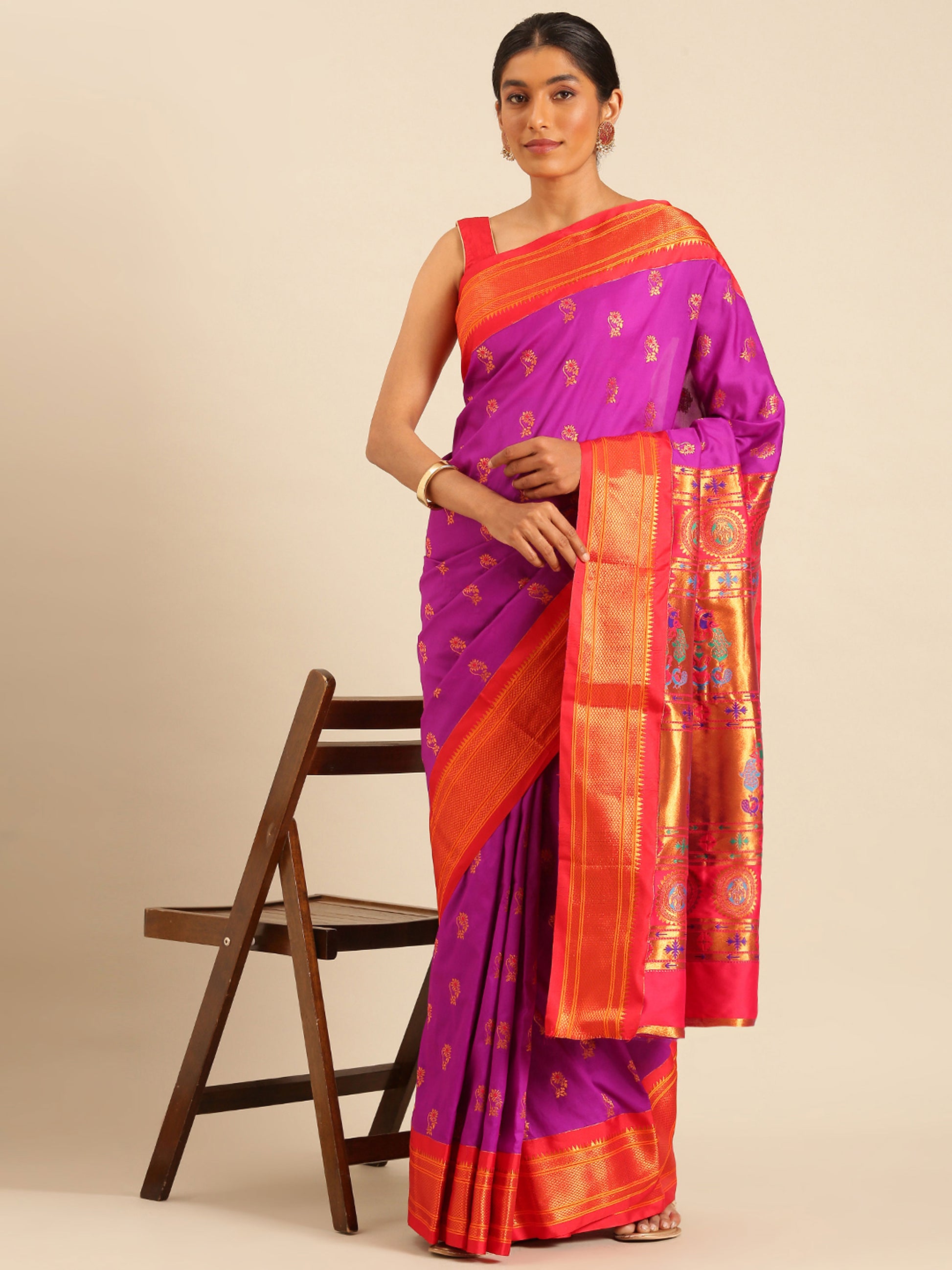 Explore The Collection Of Beautifully Designed Purple & Red Soft Silk Peshwai Nath Paithani Saree With Blouse Piece From Varkala Silk Sarees. Elevate Your Ethnic Wardrobe With The Exquisite Peshwai Nath Paithani Saree, A Timeless Masterpiece That Blends Tradition With Elegance. Crafted From Soft Silk Fabric With A Blend Of 70% Polyester And 30% Silk, This Saree Offers A Luxurious Drape And A Subtle Sheen, Perfect For Grand Occasions. Measuring 5.5 Meters With A 0.8-Meter Blouse Piece, It Features A Copper Zari Woven Intricate Checks Kadiyal Border That Exudes Grace. The Body Is Adorned With Copper Zari Peshwai Nath Meena Butti, While The Pallu Showcases Rich Copper Zari Woven Peacock Motifs, Symbolizing Prosperity. Enhanced With Zari And Multicolor Resham Silk Thread Embellishments, This Woven Kadiyal Paithani Saree Is Ideal For Weddings, Parties, And Festivals. Pair It With Traditional Jewelry For A Regal Look. Dry Clean For The First Wash, Followed By Gentle Hand Wash. Redefine Your Style With This Heritage-Rich Saree, A Perfect Blend Of Culture And Sophistication.