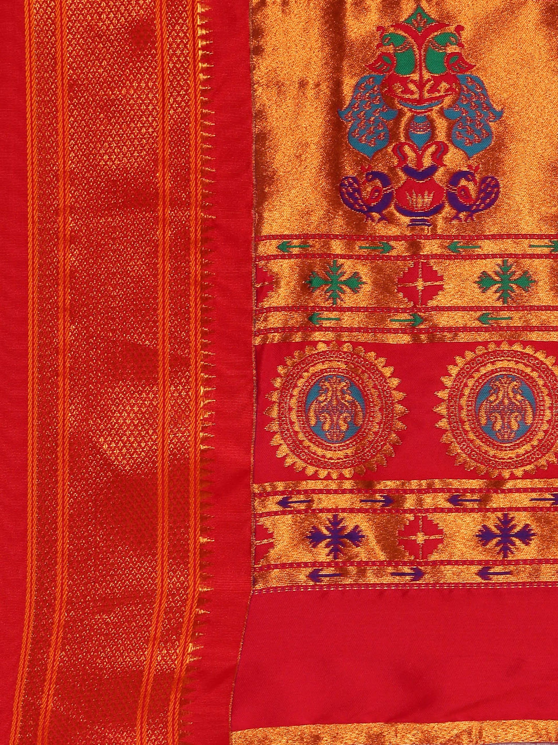 Explore The Collection Of Beautifully Designed Royal Blue & Red Soft Silk Peshwai Nath Paithani Saree With Blouse Piece From Varkala Silk Sarees. Elevate Your Ethnic Wardrobe With The Exquisite Peshwai Nath Paithani Saree, A Timeless Masterpiece That Blends Tradition With Elegance. Crafted From Soft Silk Fabric With A Blend Of 70% Polyester And 30% Silk, This Saree Offers A Luxurious Drape And A Subtle Sheen, Perfect For Grand Occasions. Measuring 5.5 Meters With A 0.8-Meter Blouse Piece, It Features A Copper Zari Woven Intricate Checks Kadiyal Border That Exudes Grace. The Body Is Adorned With Copper Zari Peshwai Nath Meena Butti, While The Pallu Showcases Rich Copper Zari Woven Peacock Motifs, Symbolizing Prosperity. Enhanced With Zari And Multicolor Resham Silk Thread Embellishments, This Woven Kadiyal Paithani Saree Is Ideal For Weddings, Parties, And Festivals. Pair It With Traditional Jewelry For A Regal Look. Dry Clean For The First Wash, Followed By Gentle Hand Wash. Redefine Your Style With This Heritage-Rich Saree, A Perfect Blend Of Culture And Sophistication.