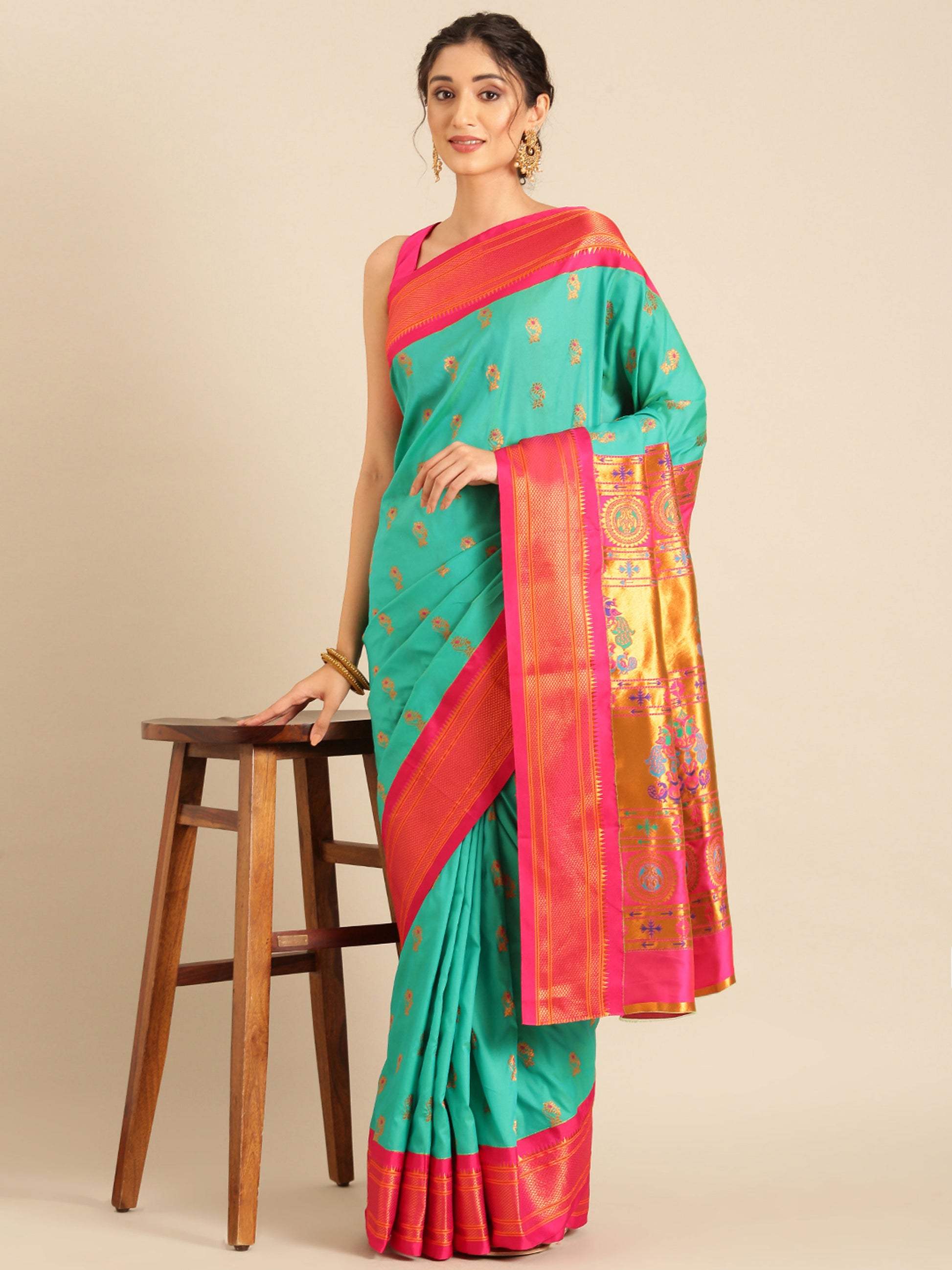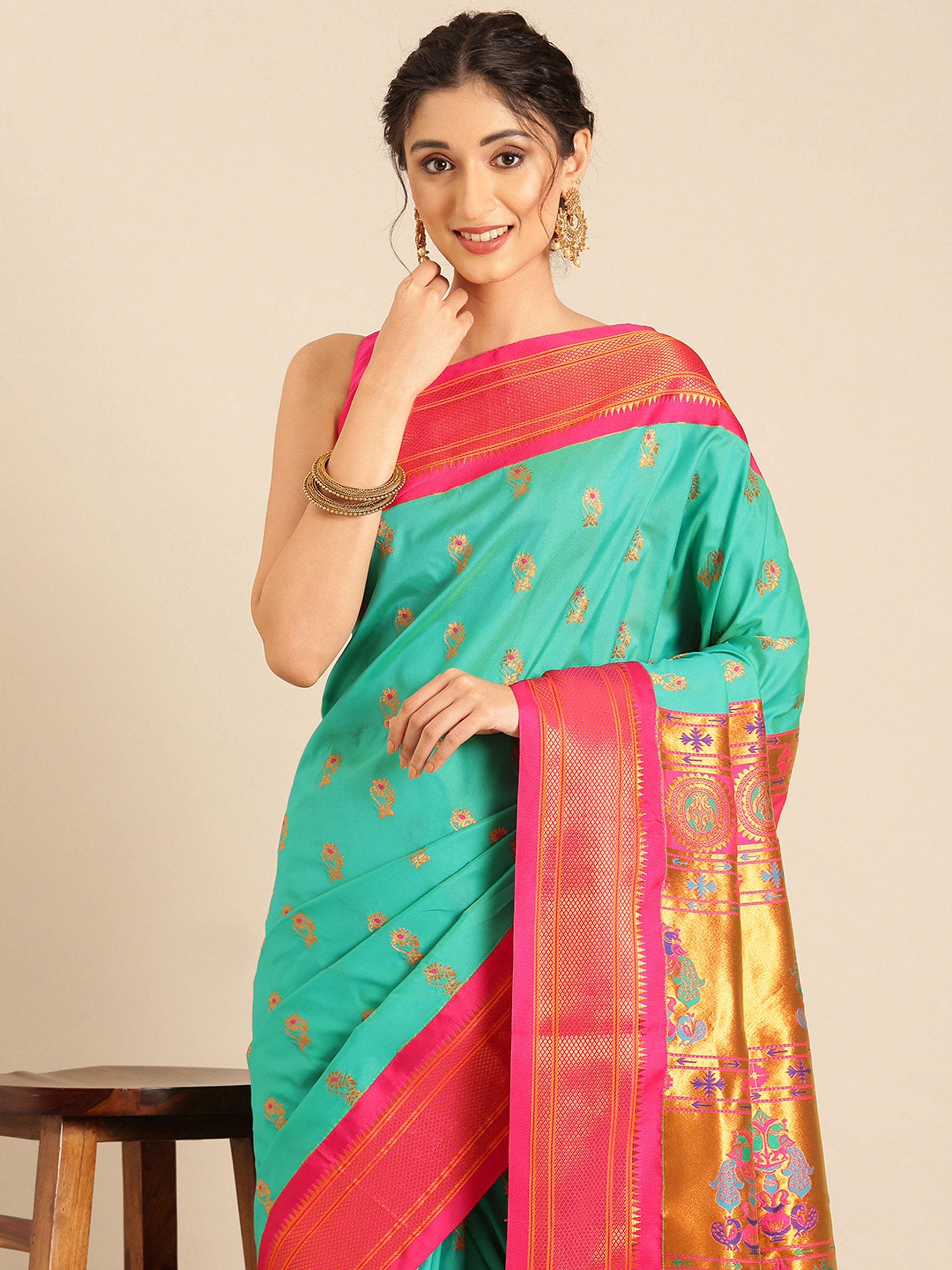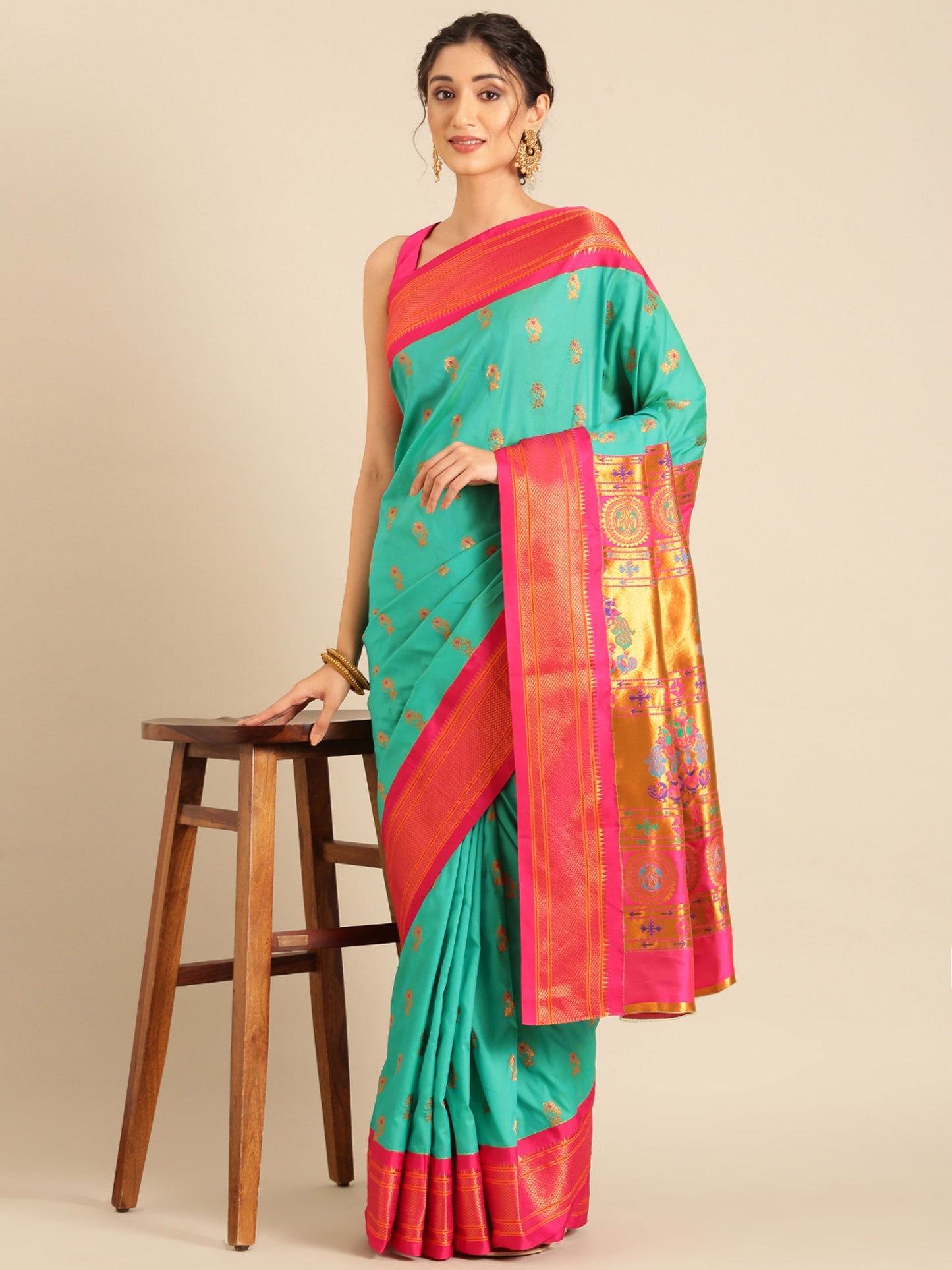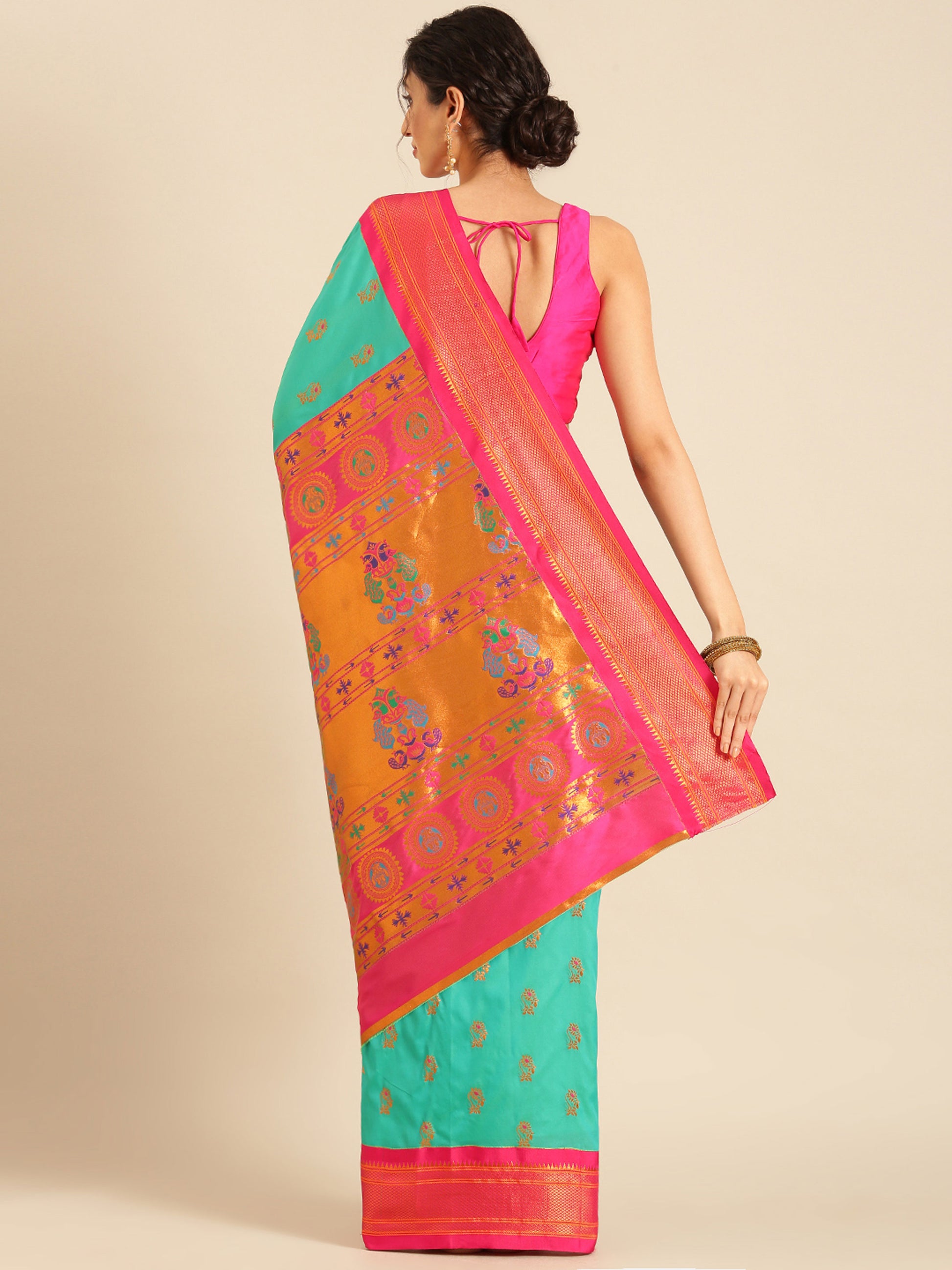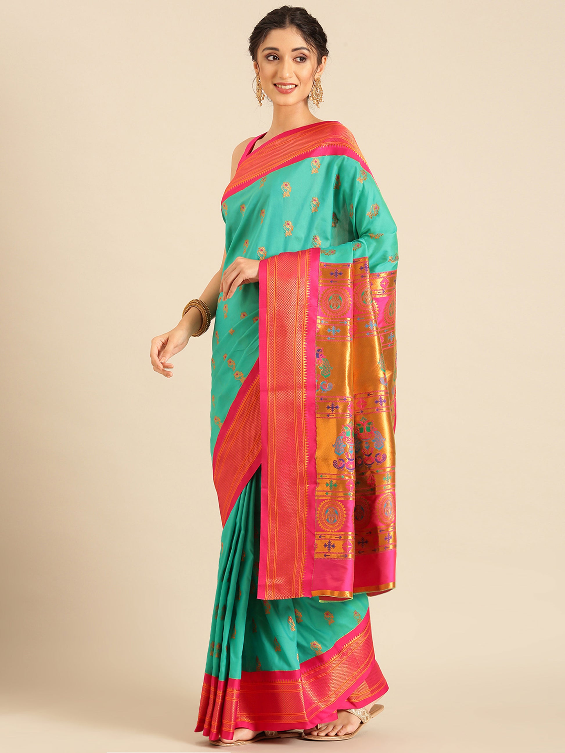 Ahilya Sea Green & Pink Soft Silk Peshwai Nath Paithani Saree