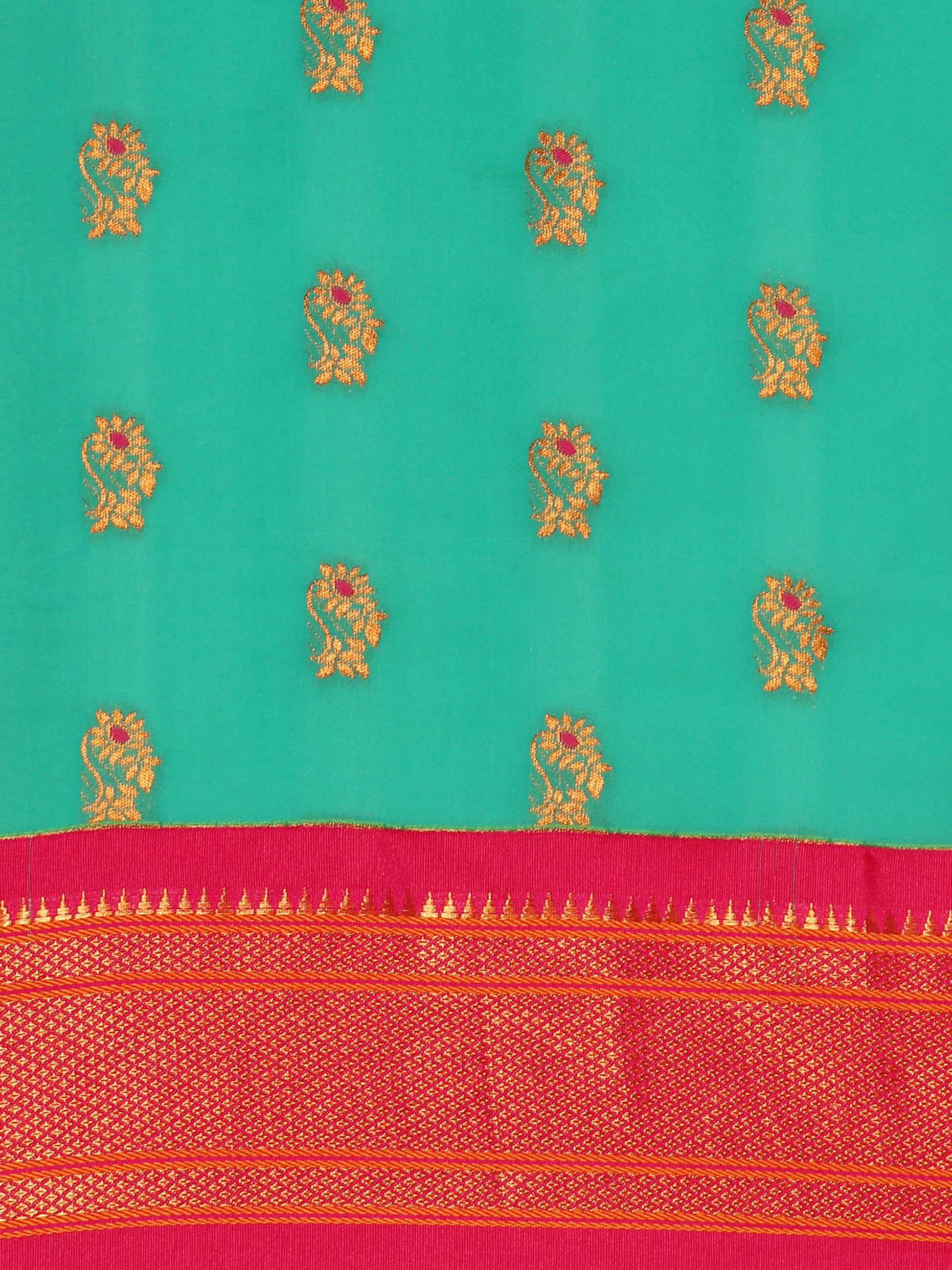Explore The Collection Of Beautifully Designed Sea Green & Pink Soft Silk Peshwai Nath Paithani Saree With Blouse Piece From Varkala Silk Sarees. Elevate Your Ethnic Wardrobe With The Exquisite Peshwai Nath Paithani Saree, A Timeless Masterpiece That Blends Tradition With Elegance. Crafted From Soft Silk Fabric With A Blend Of 70% Polyester And 30% Silk, This Saree Offers A Luxurious Drape And A Subtle Sheen, Perfect For Grand Occasions. Measuring 5.5 Meters With A 0.8-Meter Blouse Piece, It Features A Copper Zari Woven Intricate Checks Kadiyal Border That Exudes Grace. The Body Is Adorned With Copper Zari Peshwai Nath Meena Butti, While The Pallu Showcases Rich Copper Zari Woven Peacock Motifs, Symbolizing Prosperity. Enhanced With Zari And Multicolor Resham Silk Thread Embellishments, This Woven Kadiyal Paithani Saree Is Ideal For Weddings, Parties, And Festivals. Pair It With Traditional Jewelry For A Regal Look. Dry Clean For The First Wash, Followed By Gentle Hand Wash. Pinkefine Your Style With This Heritage-Rich Saree, A Perfect Blend Of Culture And Sophistication.