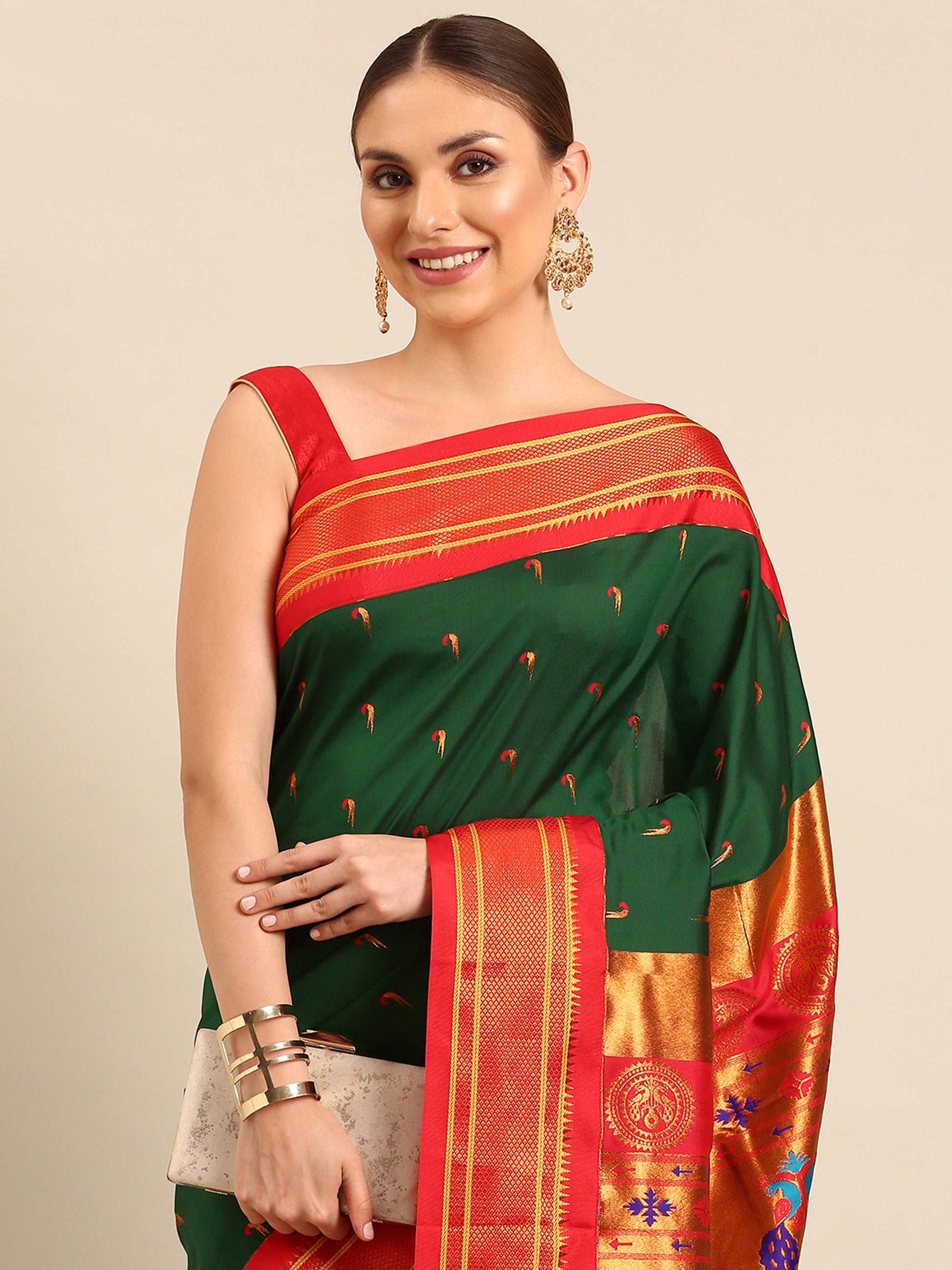 Amruta Bottle Green & Red Soft Silk Muniya Paithani Saree