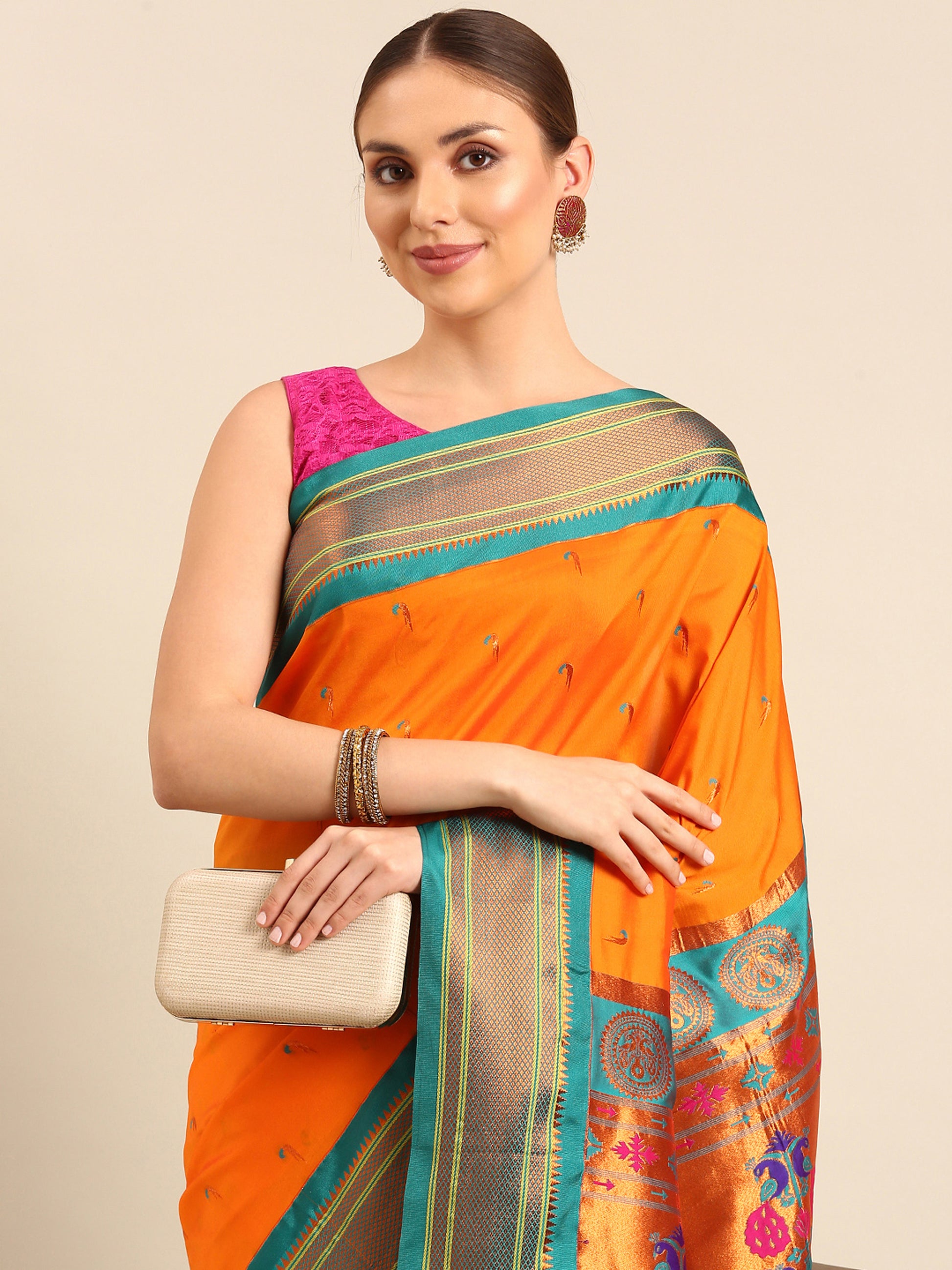 Amruta Mango Orange & Rama Soft Silk Muniya Paithani Saree