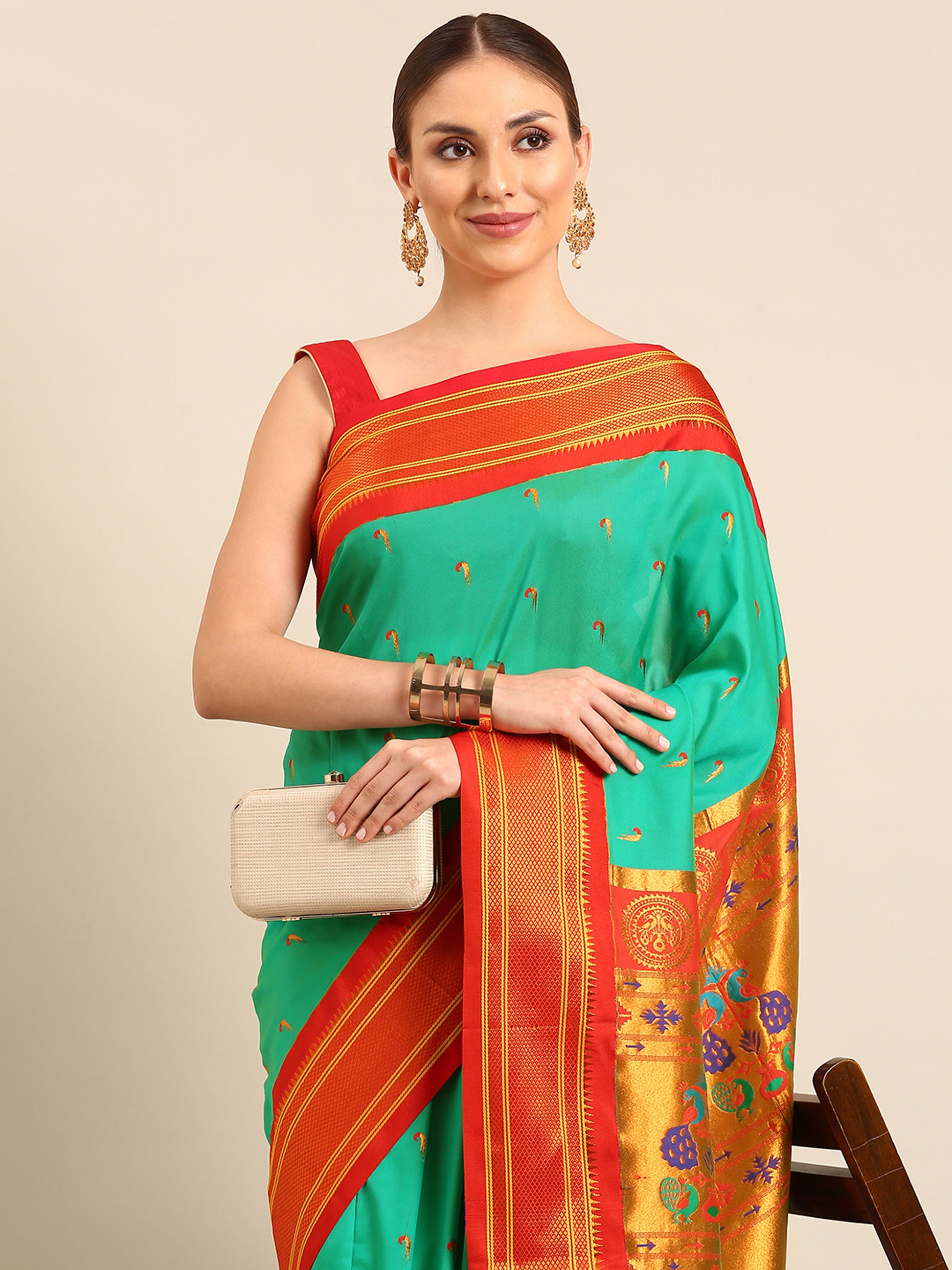 Explore The Collection Of Beautifully Designed Sea Green & Red Soft Silk Muniya Paithani Saree With Blouse Piece From Varkala Silk Sarees. Elegance Meets Tradition In The Soft Silk Muniya Paithani Saree, A Timeless Masterpiece Perfect For Weddings, Parties, And Festivals. Crafted With Precision, This Saree Boasts An Intricate Checks Design Border That Adds A Touch Of Sophistication. Its Body Is Adorned With Delicate Copper Zari Muniya Meena Butti, Exuding Grace With Every Drape. The Highlight Of This Saree Is Its Copper Zari Woven Peacock Motifs Pallu, Symbolizing Beauty And Grace. Accompanied By An Unstitched Blouse Piece, This Saree Is A Symbol Of Timeless Charm And Cultural Heritage.