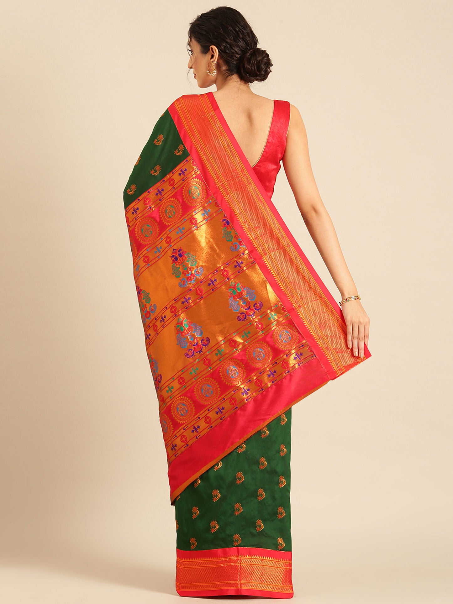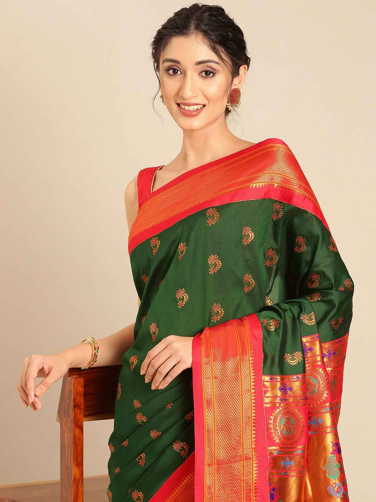 Baanai Bottle Green & Red Soft Silk Peshwai Nath Paithani Saree
