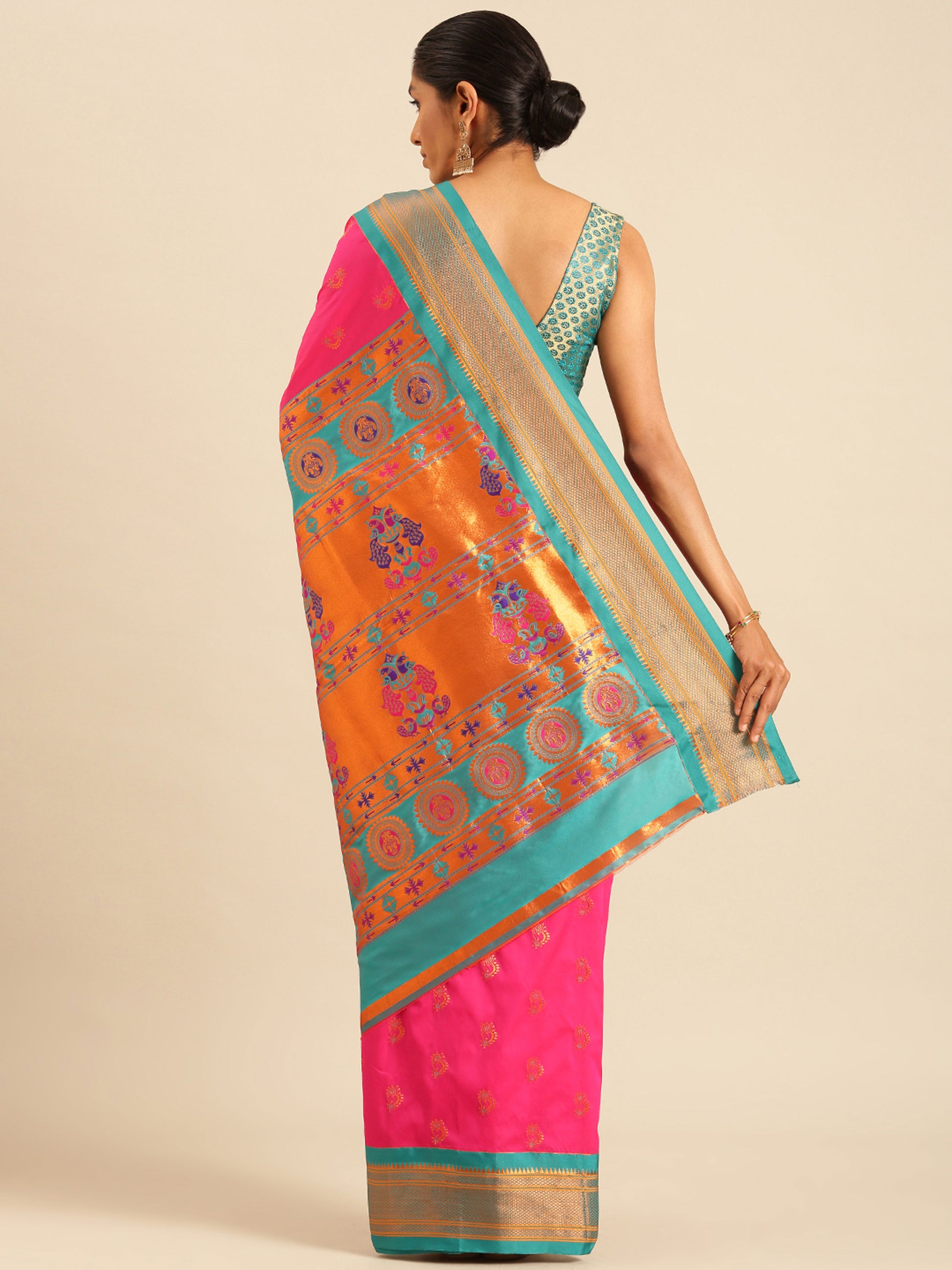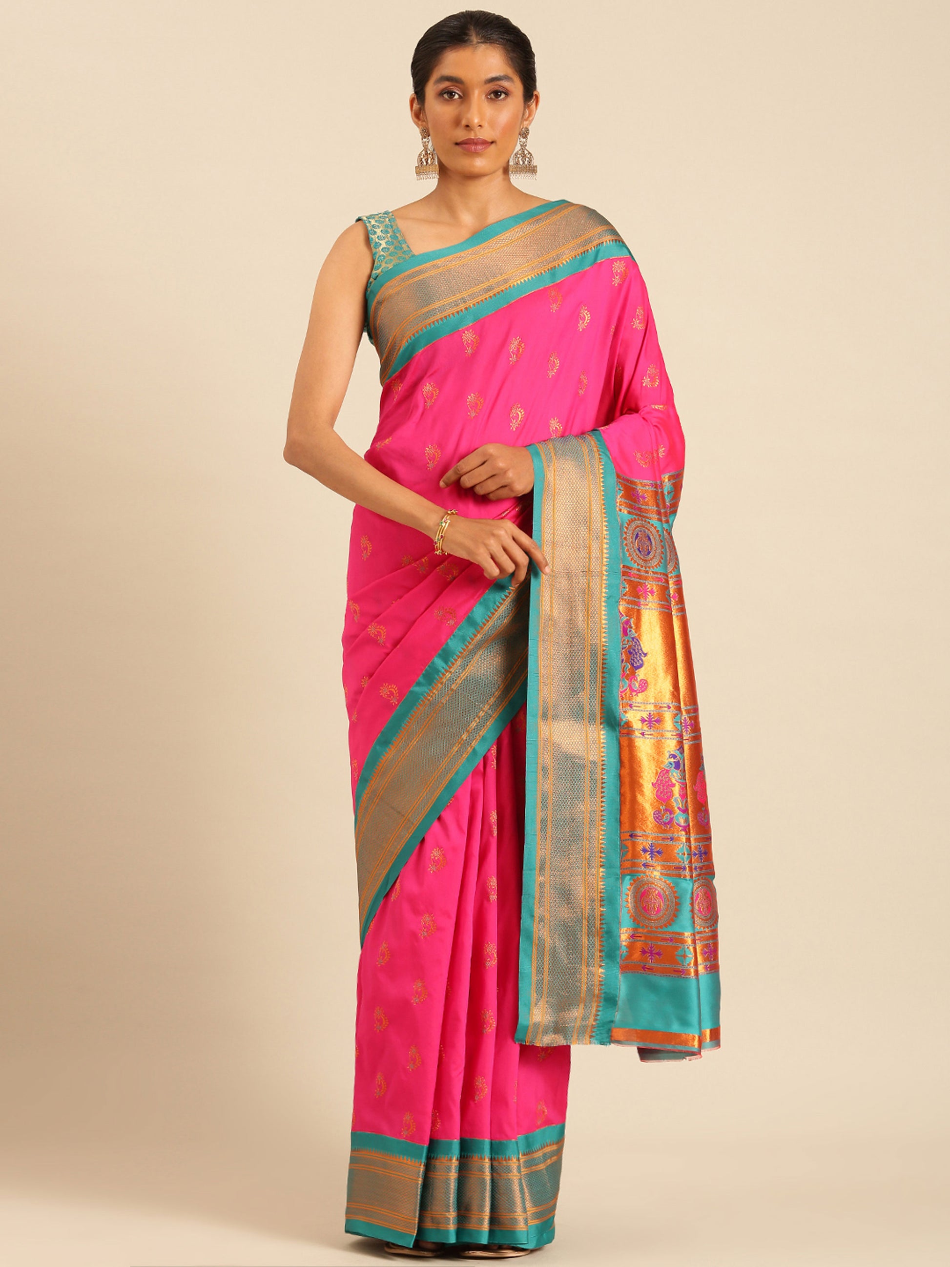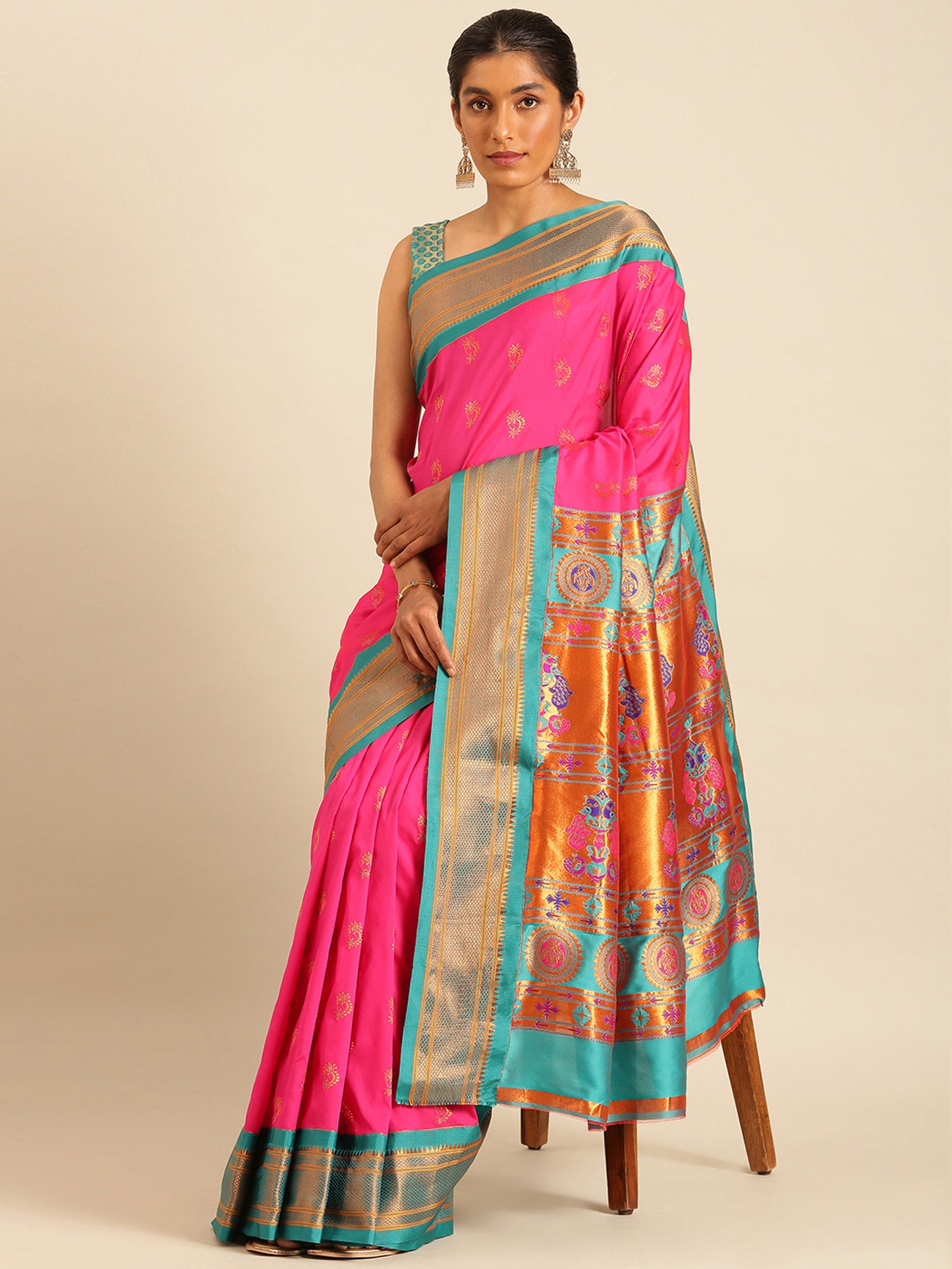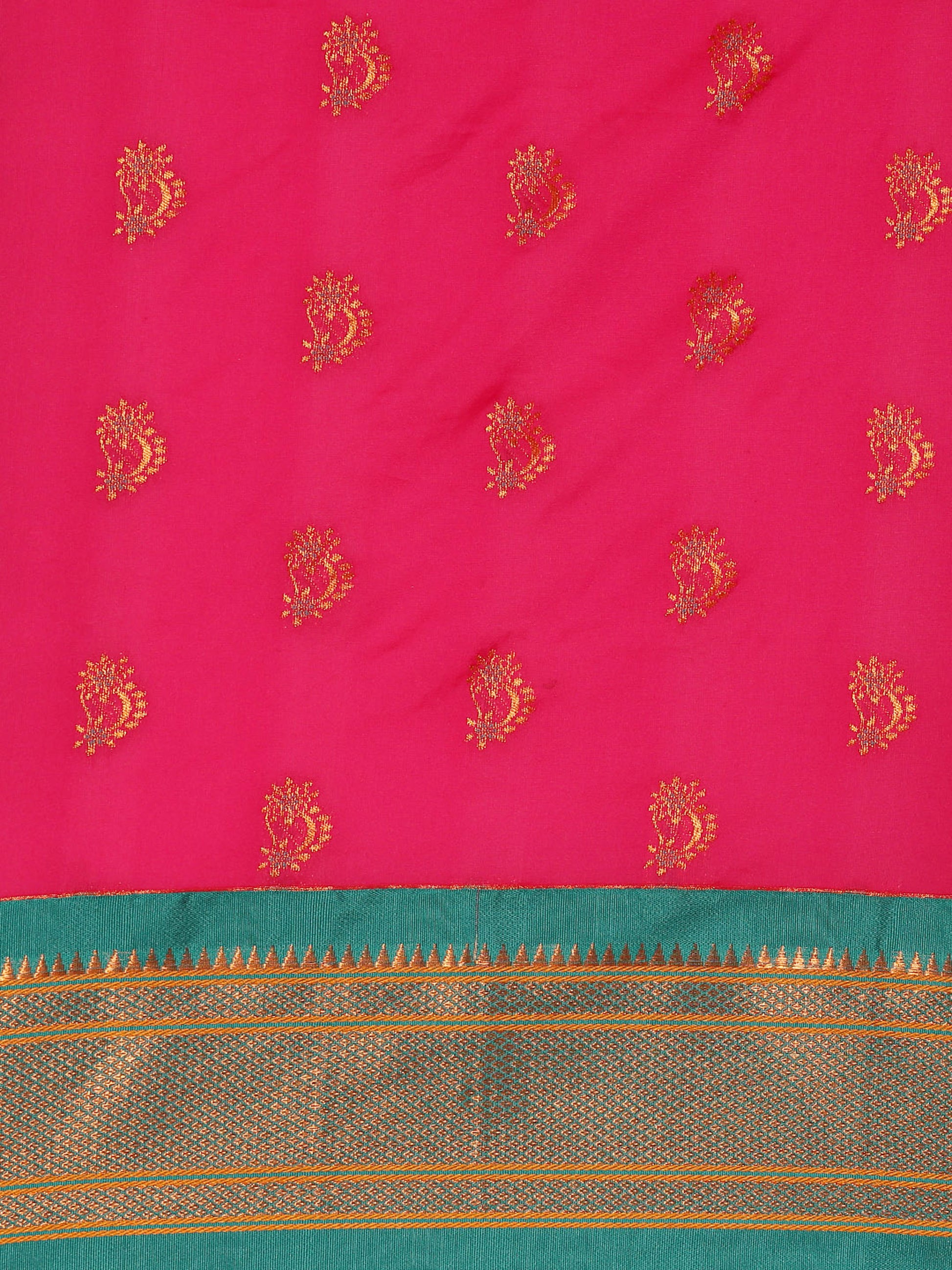Baanai Hot Pink & Rama Soft Silk Peshwai Nath Paithani Saree