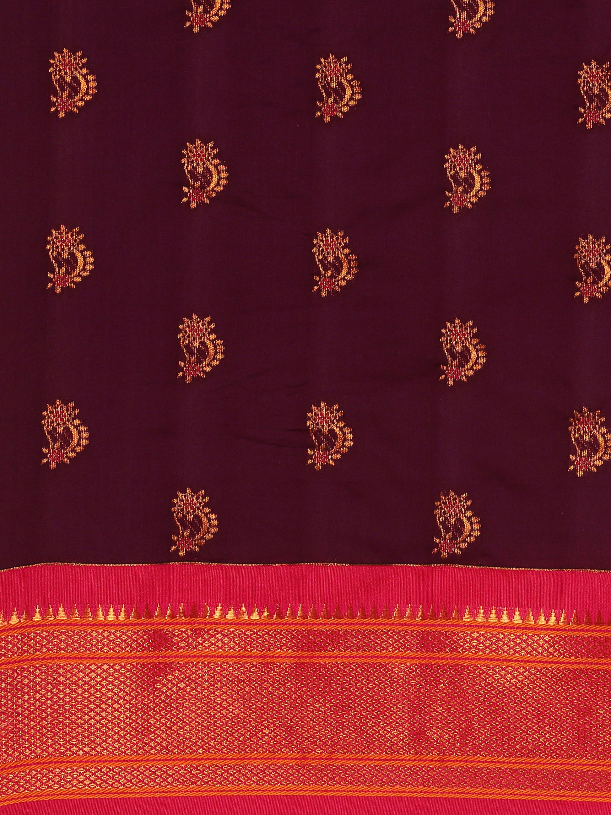 Explore The Collection Of Beautifully Designed Maroon & Pink Soft Silk Peshwai Nath Paithani Saree With Blouse Piece From Varkala Silk Sarees On Amazon. Elevate Your Ethnic Wardrobe With The Exquisite Peshwai Nath Paithani Saree, A Timeless Masterpiece That Blends Tradition With Elegance. Crafted From Soft Silk Fabric With A Blend Of 70% Polyester And 30% Silk, This Saree Offers A Luxurious Drape And A Subtle Sheen, Perfect For Grand Occasions. Measuring 5.5 Meters With A 0.8-Meter Blouse Piece, It Features A Copper Zari Woven Intricate Checks Kadiyal Border That Exudes Grace. The Body Is Adorned With Copper Zari Peshwai Nath Meena Butti, While The Pallu Showcases Rich Copper Zari Woven Peacock Motifs, Symbolizing Prosperity. Enhanced With Zari And Multicolor Resham Silk Thread Embellishments, This Woven Kadiyal Paithani Saree Is Ideal For Weddings, Parties, And Festivals. Pair It With Traditional Jewelry For A Regal Look. Dry Clean For The First Wash, Followed By Gentle Hand Wash. Redefine Your Style With This Heritage-Rich Saree, A Perfect Blend Of Culture And Sophistication.