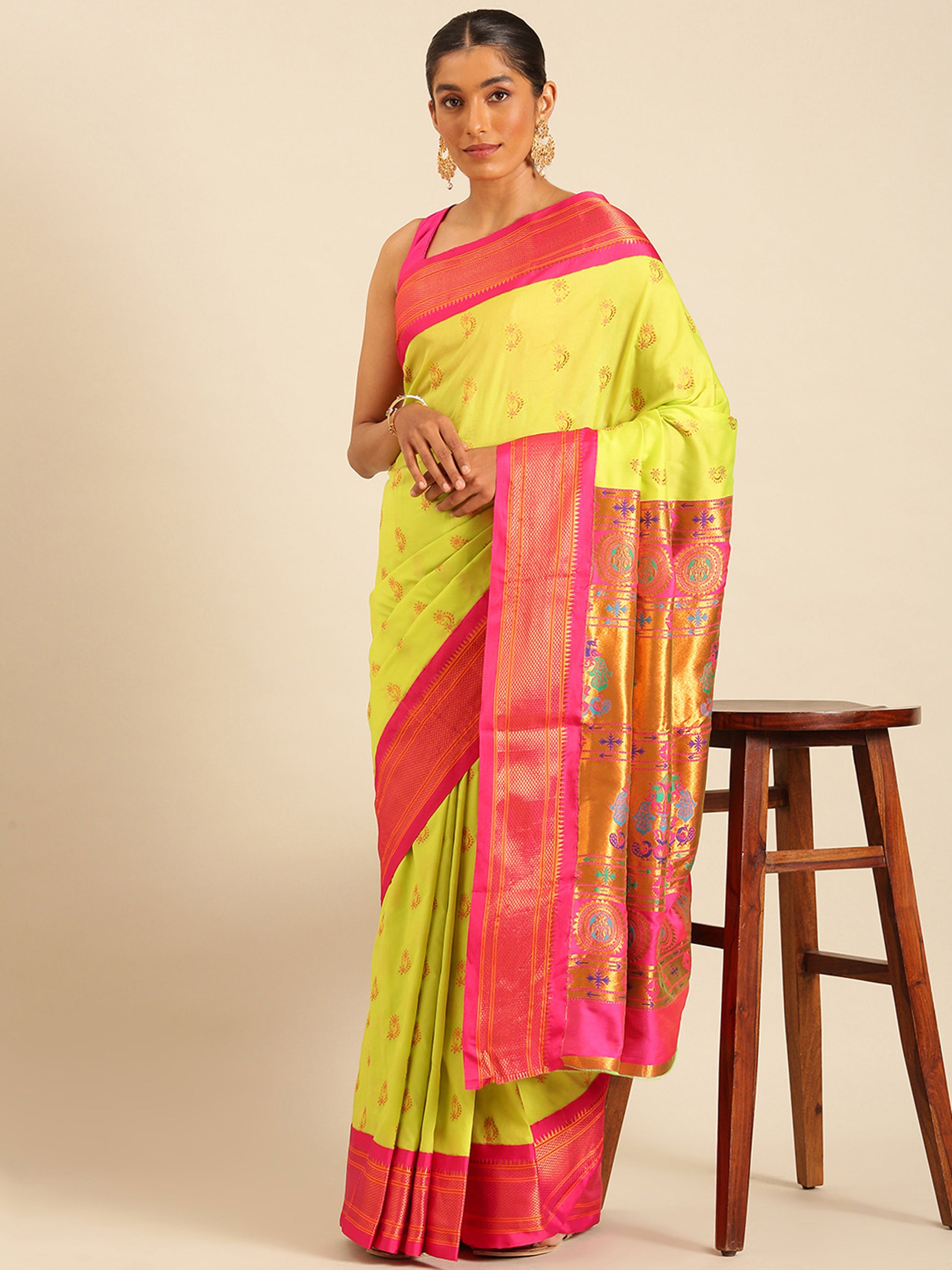 Explore The Collection Of Beautifully Designed Popati & Pink Soft Silk Peshwai Nath Paithani Saree With Blouse Piece From Varkala Silk Sarees On Amazon. Elevate Your Ethnic Wardrobe With The Exquisite Peshwai Nath Paithani Saree, A Timeless Masterpiece That Blends Tradition With Elegance. Crafted From Soft Silk Fabric With A Blend Of 70% Polyester And 30% Silk, This Saree Offers A Luxurious Drape And A Subtle Sheen, Perfect For Grand Occasions. Measuring 5.5 Meters With A 0.8-Meter Blouse Piece, It Features A Copper Zari Woven Intricate Checks Kadiyal Border That Exudes Grace. The Body Is Adorned With Copper Zari Peshwai Nath Meena Butti, While The Pallu Showcases Rich Copper Zari Woven Peacock Motifs, Symbolizing Prosperity. Enhanced With Zari And Multicolor Resham Silk Thread Embellishments, This Woven Kadiyal Paithani Saree Is Ideal For Weddings, Parties, And Festivals. Pair It With Traditional Jewelry For A Regal Look. Dry Clean For The First Wash, Followed By Gentle Hand Wash. Redefine Your Style With This Heritage-Rich Saree, A Perfect Blend Of Culture And Sophistication.