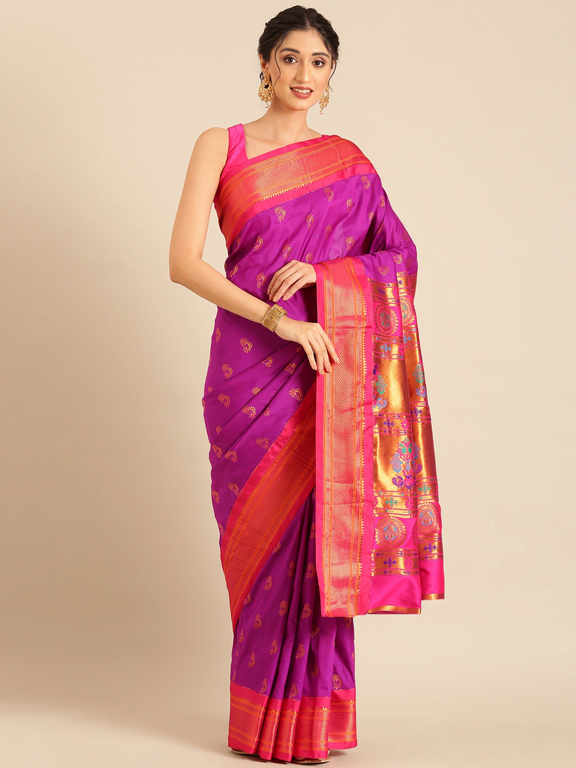 Baanai Purple & Pink Soft Silk Peshwai Nath Paithani Saree