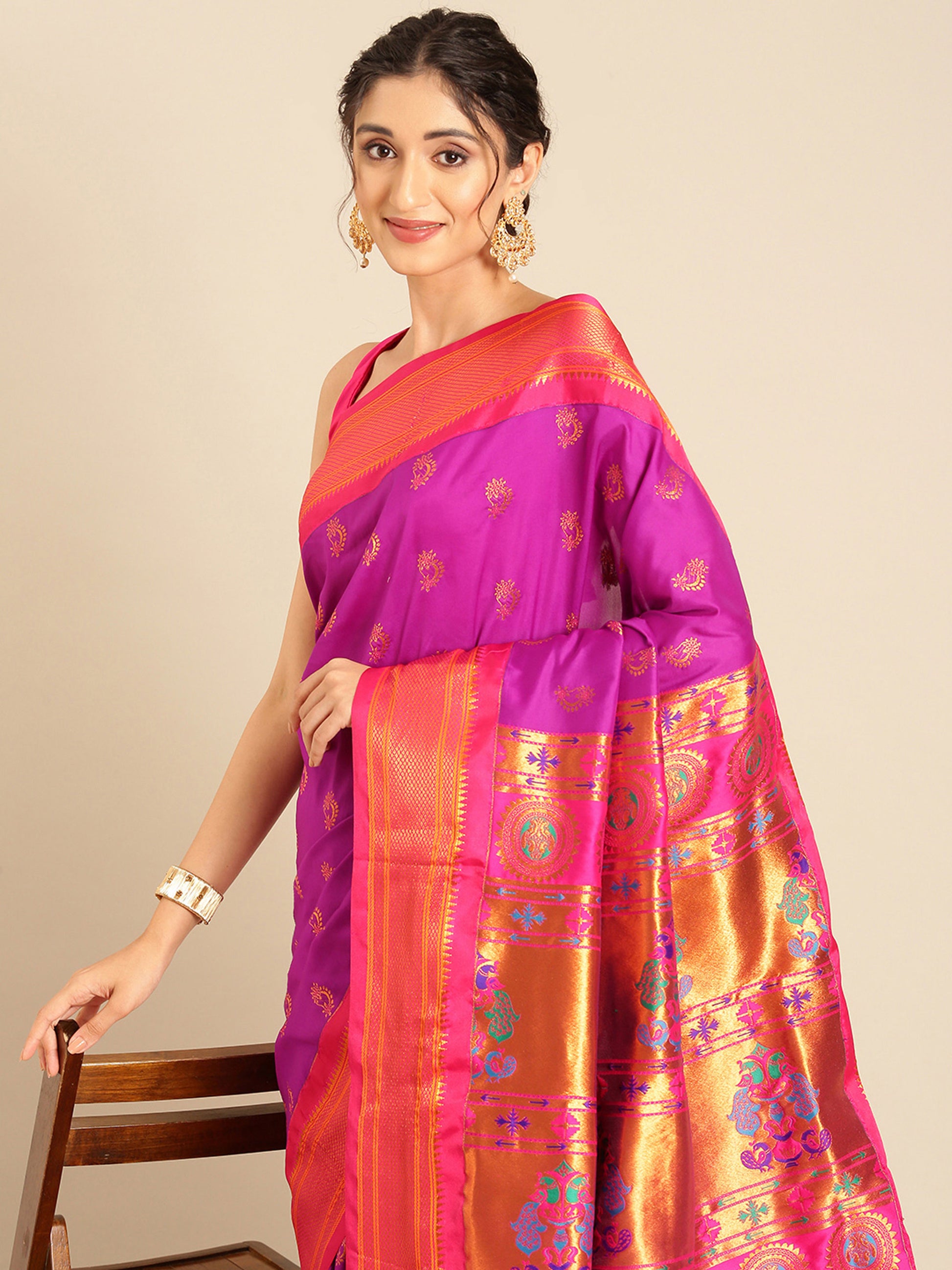 Explore The Collection Of Beautifully Designed Purple & Pink Soft Silk Peshwai Nath Paithani Saree With Blouse Piece From Varkala Silk Sarees On Amazon. Elevate Your Ethnic Wardrobe With The Exquisite Peshwai Nath Paithani Saree, A Timeless Masterpiece That Blends Tradition With Elegance. Crafted From Soft Silk Fabric With A Blend Of 70% Polyester And 30% Silk, This Saree Offers A Luxurious Drape And A Subtle Sheen, Perfect For Grand Occasions. Measuring 5.5 Meters With A 0.8-Meter Blouse Piece, It Features A Copper Zari Woven Intricate Checks Kadiyal Border That Exudes Grace. The Body Is Adorned With Copper Zari Peshwai Nath Meena Butti, While The Pallu Showcases Rich Copper Zari Woven Peacock Motifs, Symbolizing Prosperity. Enhanced With Zari And Multicolor Resham Silk Thread Embellishments, This Woven Kadiyal Paithani Saree Is Ideal For Weddings, Parties, And Festivals. Pair It With Traditional Jewelry For A Regal Look. Dry Clean For The First Wash, Followed By Gentle Hand Wash. Redefine Your Style With This Heritage-Rich Saree, A Perfect Blend Of Culture And Sophistication.