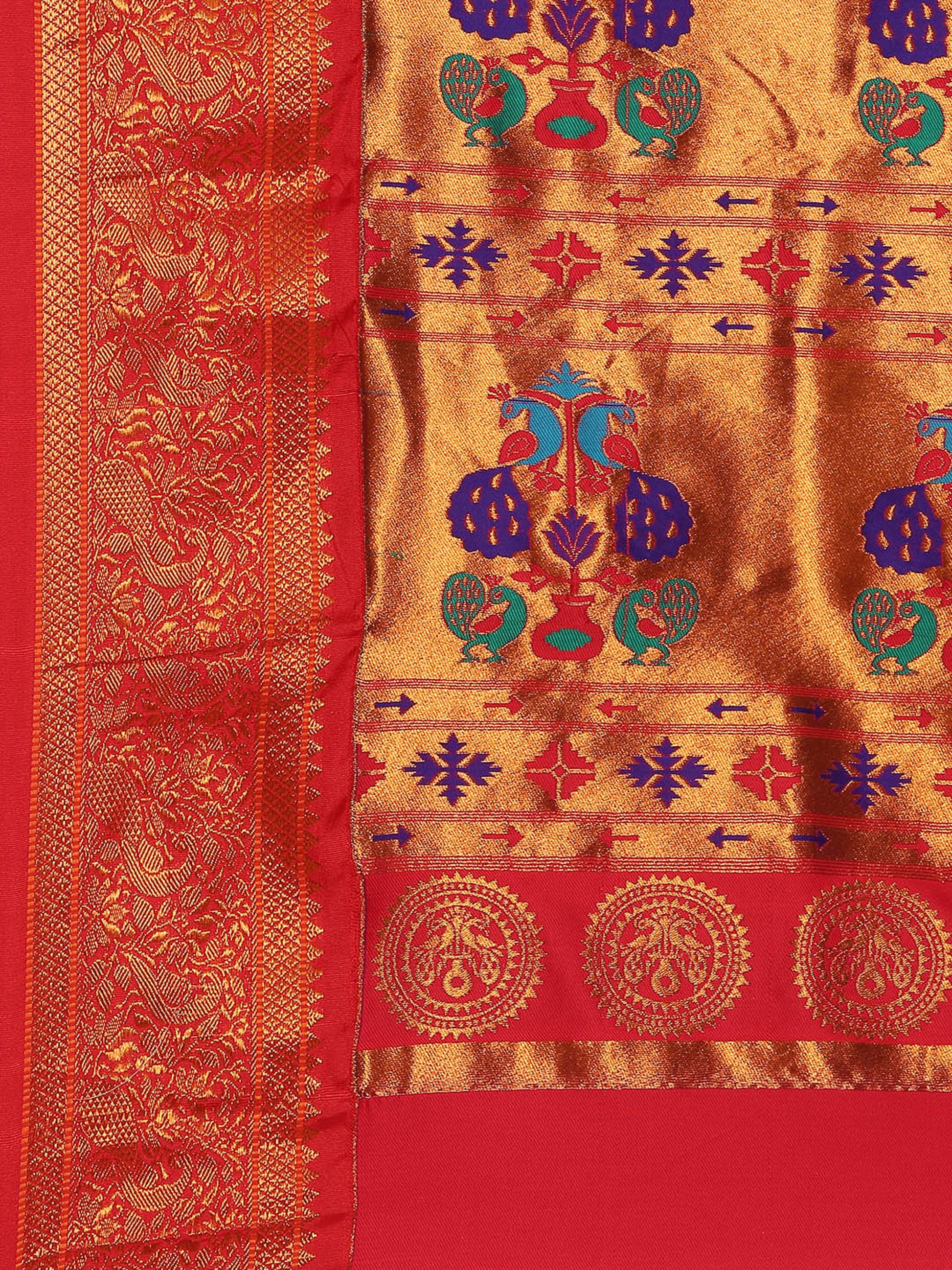 Explore The Collection Of Beautifully Designed Purple & Red Soft Silk Chandrakor Paithani Saree With Blouse Piece From Varkala Silk Sarees. This Exquisite Chandrakor Paithani Saree, Crafted In A Soft Silk Blend (70% Polyester, 30% Silk), Combines Elegance With Traditional Artistry. Measuring 5.5 Meters With a 0.8-Meter Blouse Piece, It Features Intricate Copper Zari Detailing. The Saree's Jacquard Border Is Adorned With A Stunning Peacock Design, While Copper Zari Chandrakor Motifs Decorate The Body, Adding Sophistication. The Pallu Showcases Woven Peacock Motifs In Copper Zari, Making It Perfect For Weddings, Parties, And Festive Occasions. Dry Clean For The First Wash, And Gentle Hand Washing Is Recommended Thereafter.