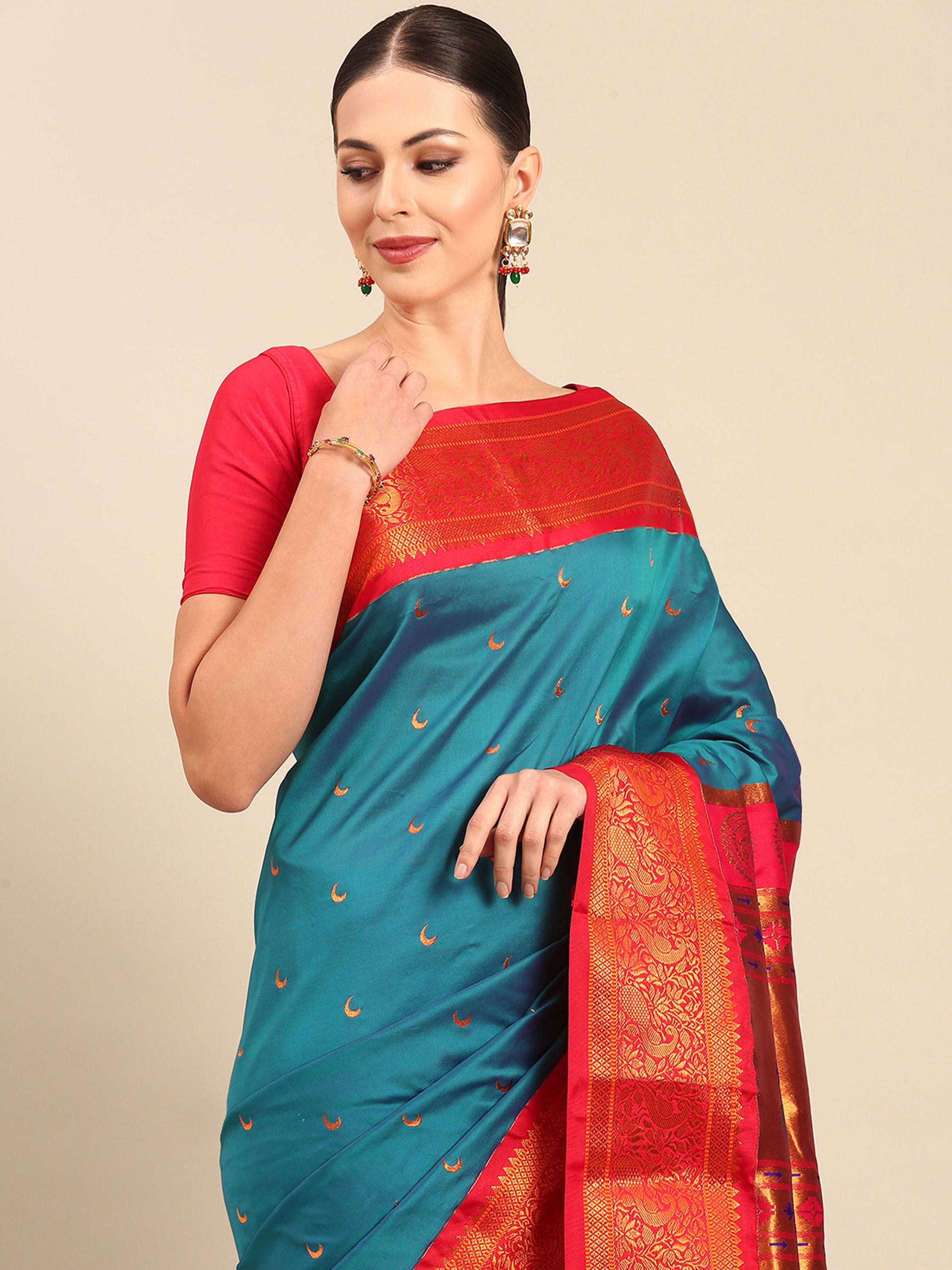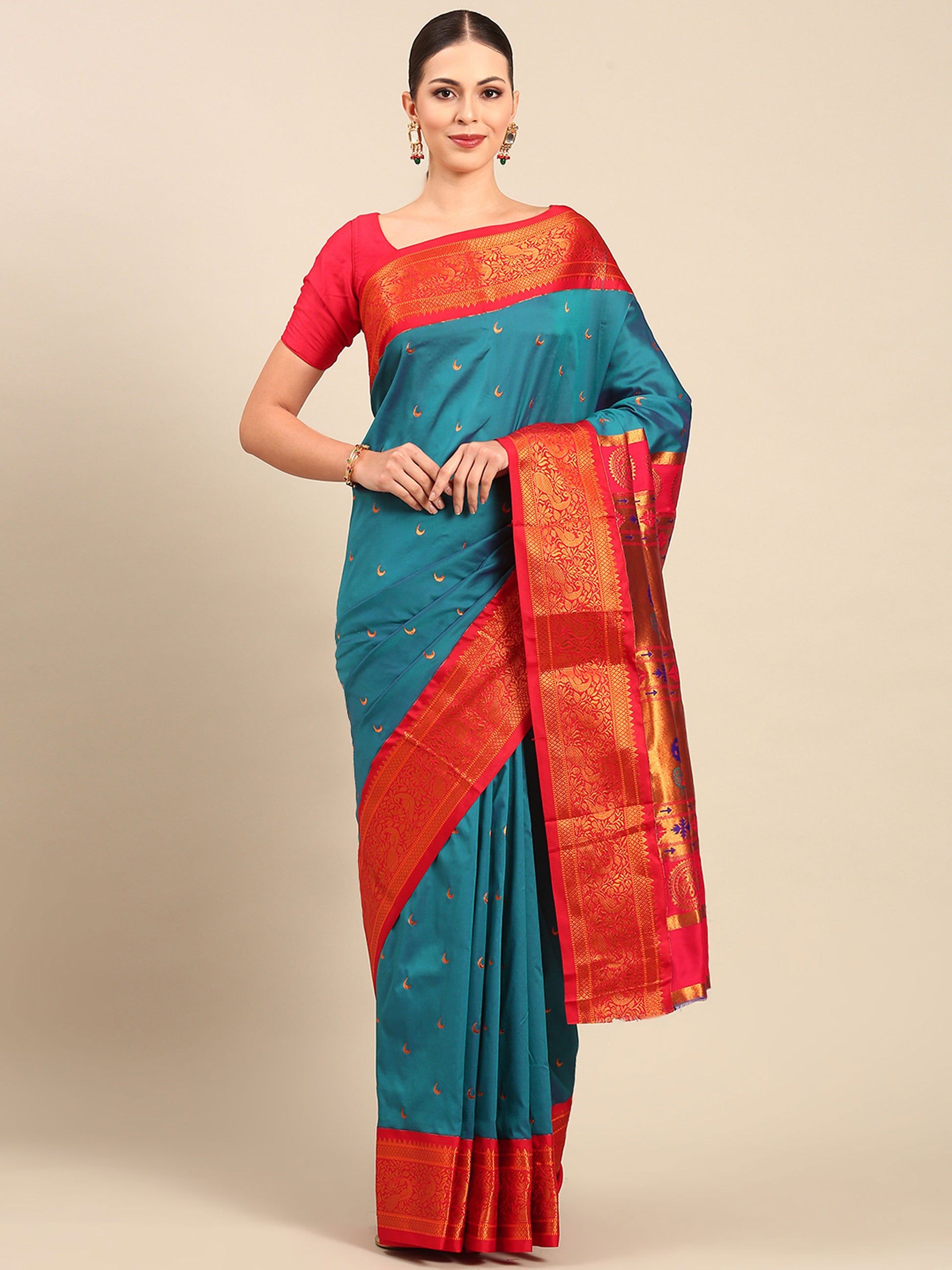 Explore The Collection Of Beautifully Designed Rama & Red Soft Silk Chandrakor Paithani Saree With Blouse Piece From Varkala Silk Sarees. This Exquisite Chandrakor Paithani Saree, Crafted In A Soft Silk Blend (70% Polyester, 30% Silk), Combines Elegance With Traditional Artistry. Measuring 5.5 Meters With a 0.8-Meter Blouse Piece, It Features Intricate Copper Zari Detailing. The Saree's Jacquard Border Is Adorned With A Stunning Peacock Design, While Copper Zari Chandrakor Motifs Decorate The Body, Adding Sophistication. The Pallu Showcases Woven Peacock Motifs In Copper Zari, Making It Perfect For Weddings, Parties, And Festive Occasions. Dry Clean For The First Wash, And Gentle Hand Washing Is Recommended Thereafter.