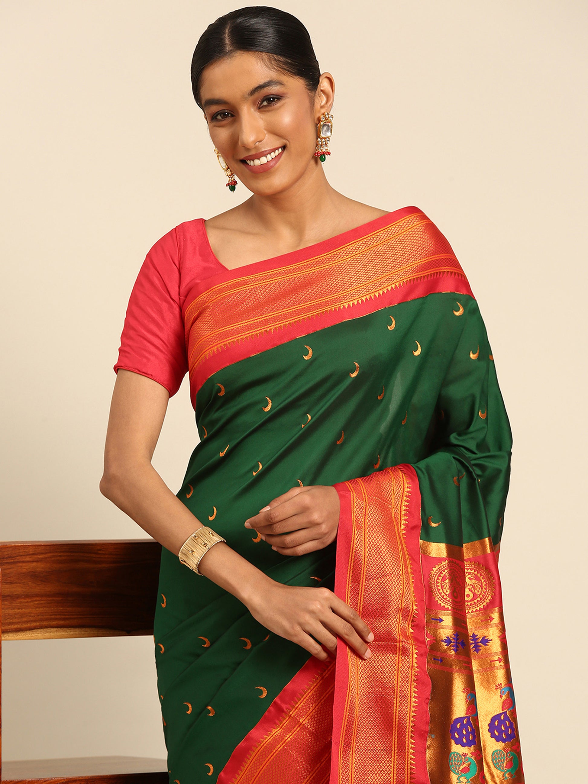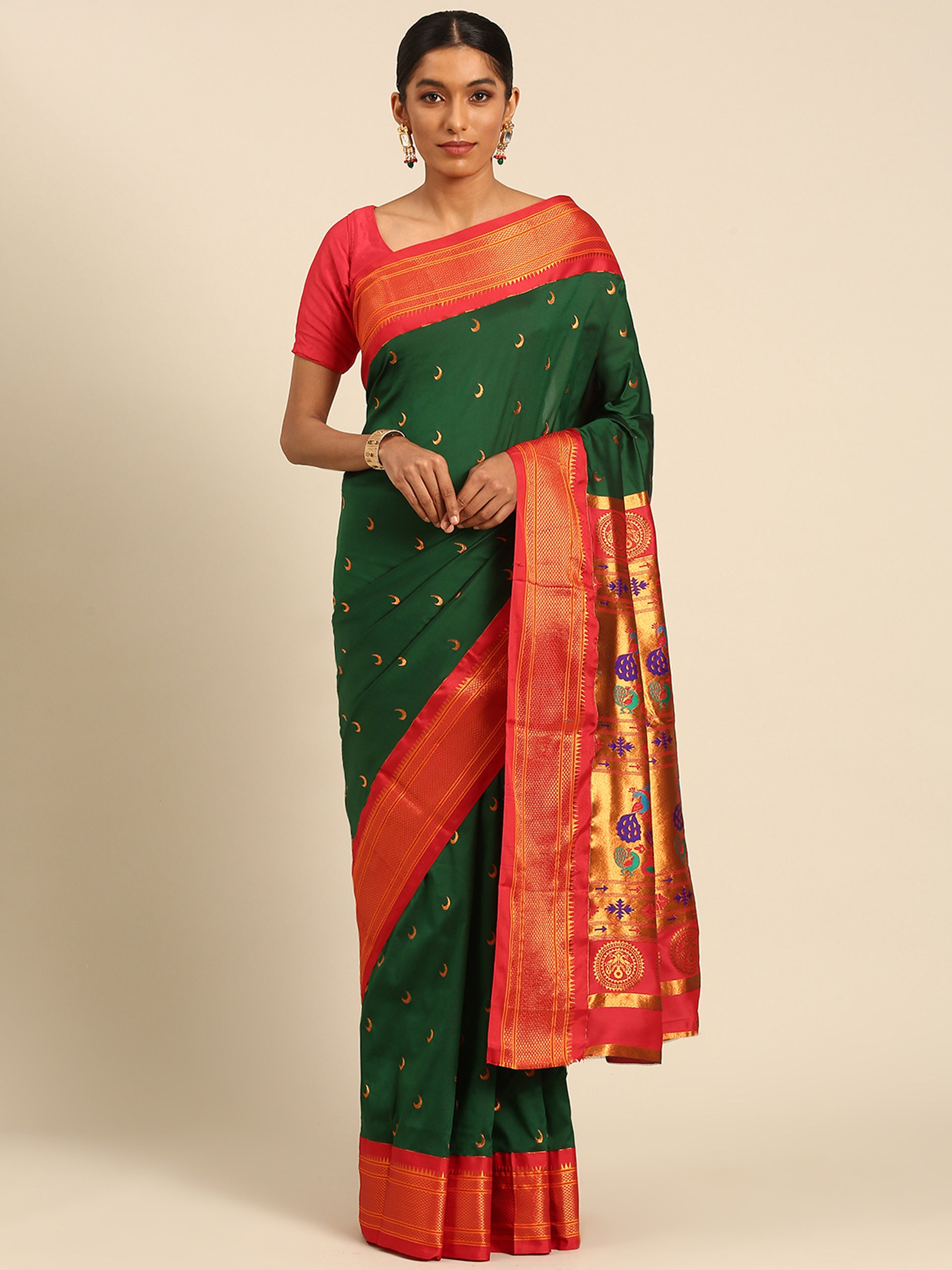 Explore The Collection Of Beautifully Designed Bottle Green & Red Soft Silk Chandrakor Paithani Saree From Varkala Silk Sarees. Indulge In Timeless Elegance With Our Soft Silk Chandrakor Paithani Saree. Its Intricate Checks Design Border Adds A Touch Of Sophistication, While The Copper Zari Chandraakor (Half Moon) Motif Butti Adorning The Body Exudes Grace. The Copper Zari Woven Peacock Motifs Pallu Enhances Its Allure, Making It Perfect For Weddings, Parties, And Festivals. Comes With An Unstitched Blouse Piece For Customization. Elevate Your Style With This Exquisite Piece Of Artistry.