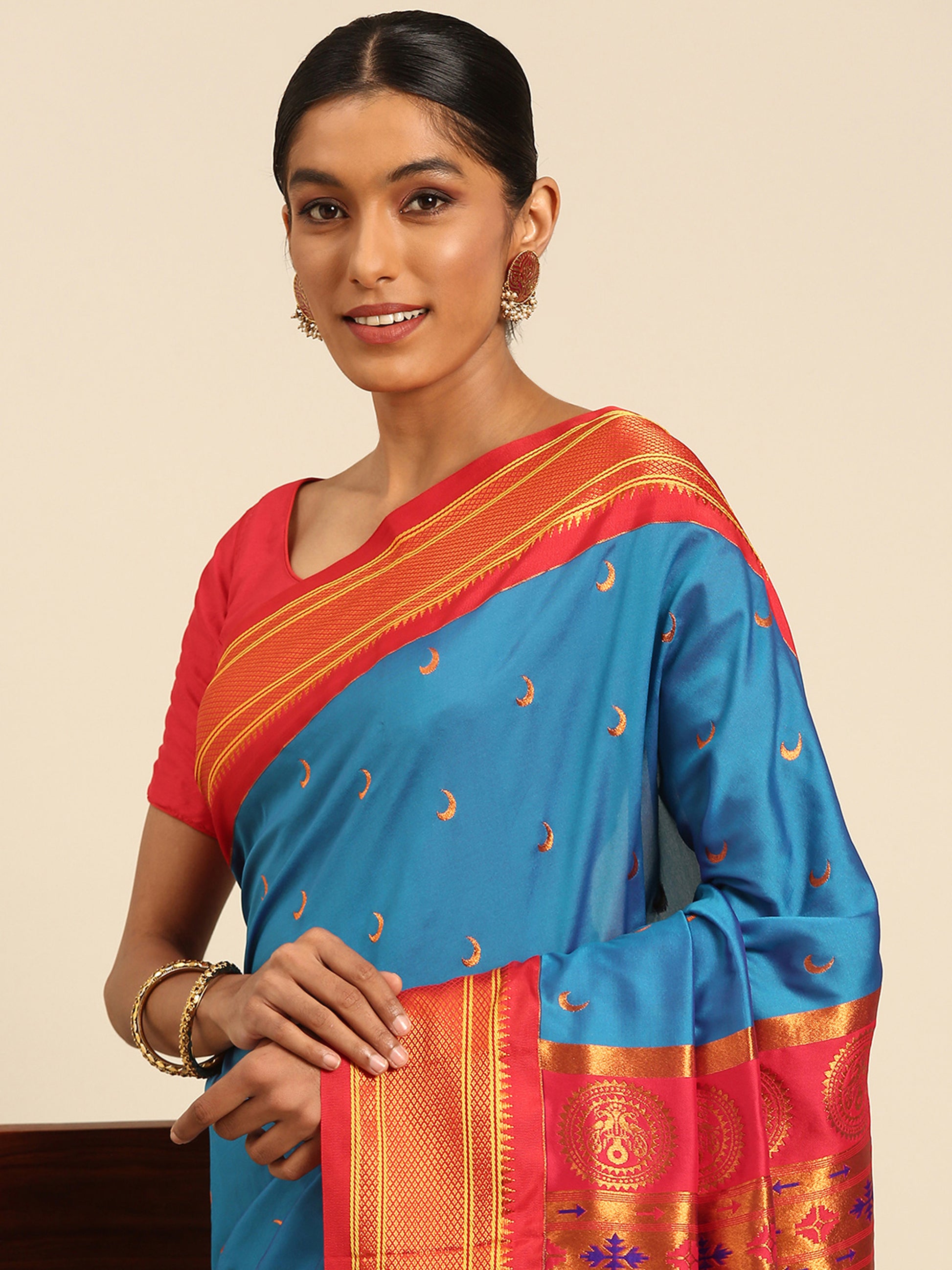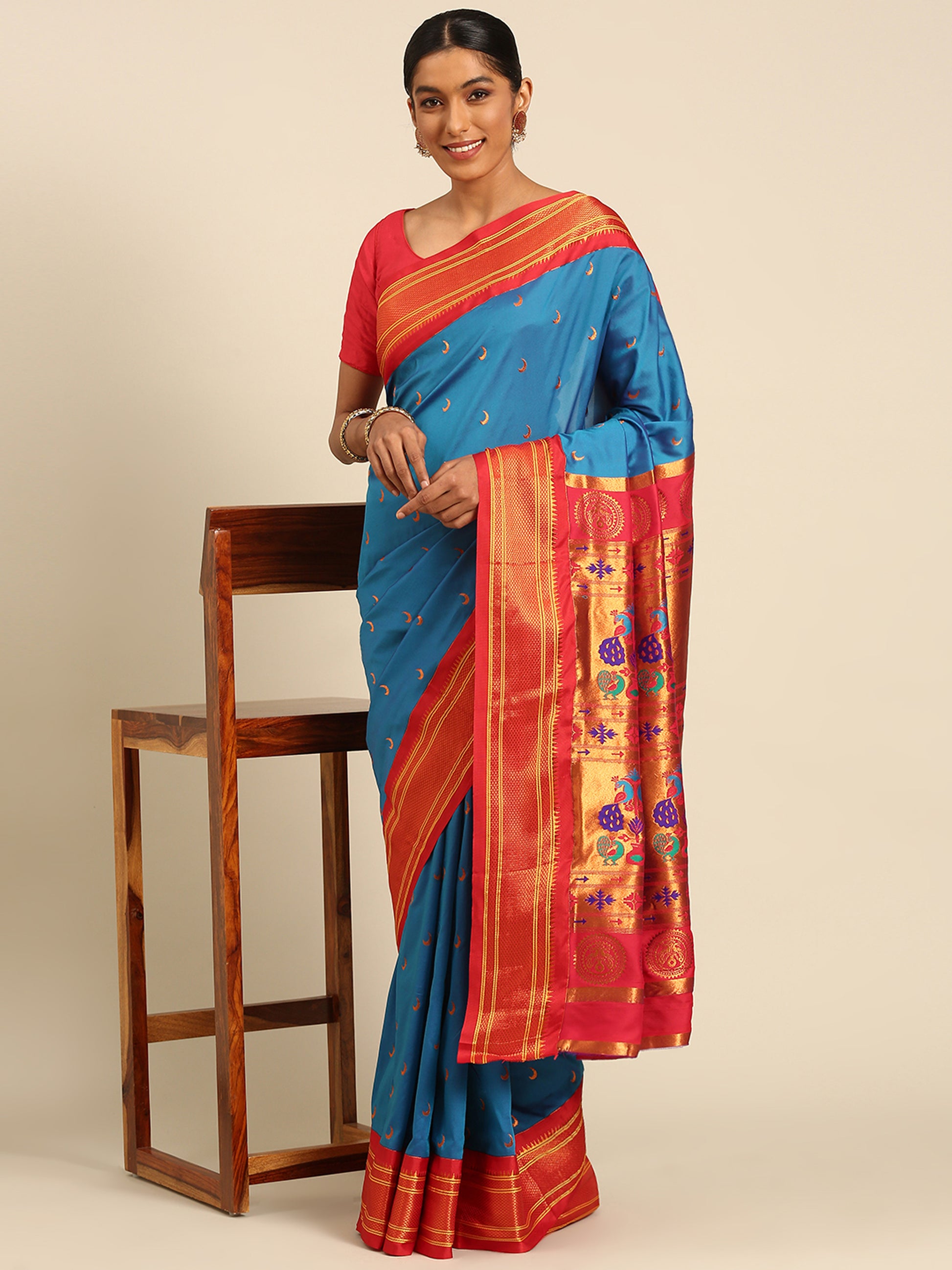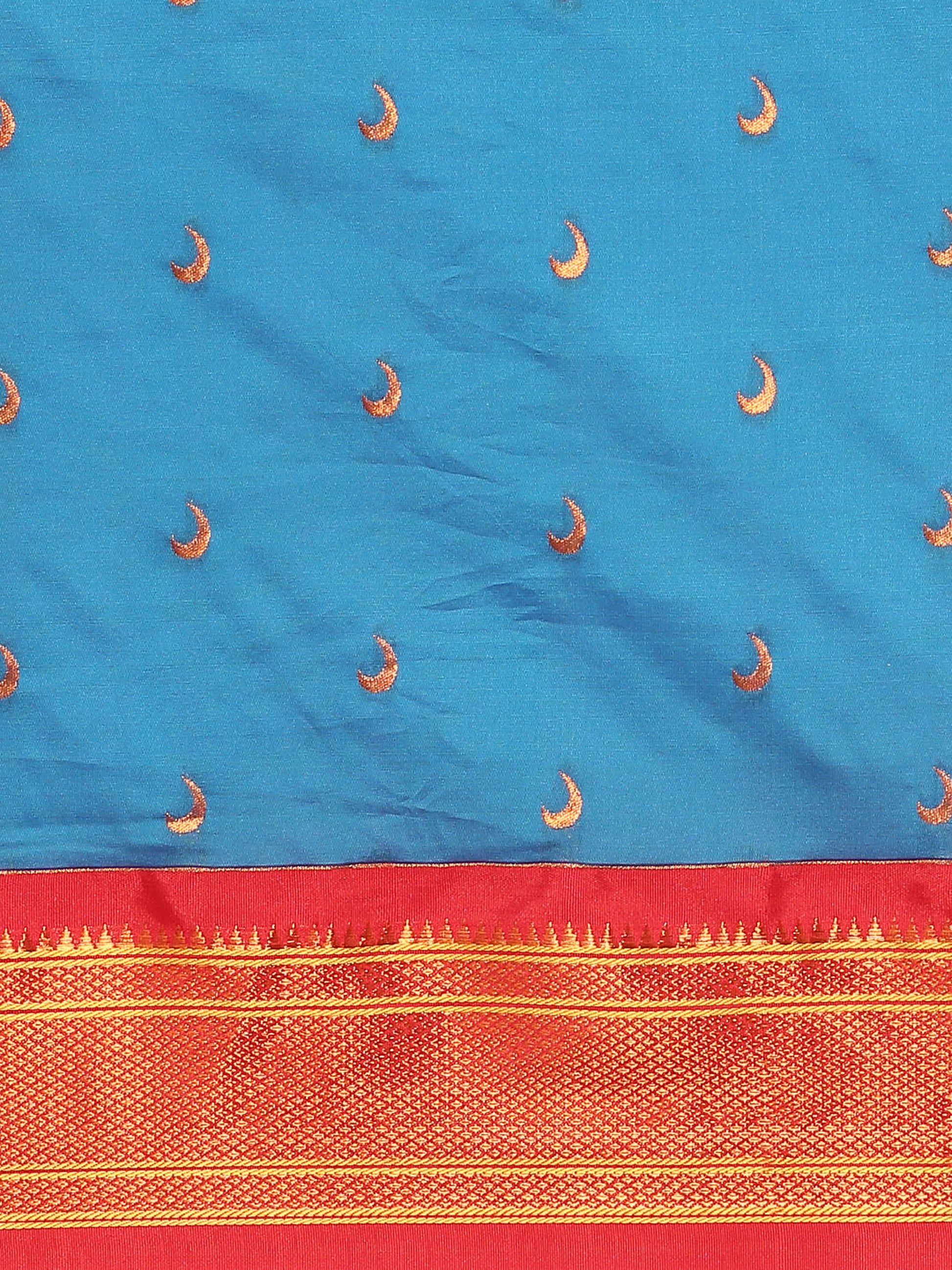 Explore The Collection Of Beautifully Designed Firozi & Red Soft Silk Chandrakor Paithani Saree From Varkala Silk Sarees. Indulge In Timeless Elegance With Our Soft Silk Chandrakor Paithani Saree. Its Intricate Checks Design Border Adds A Touch Of Sophistication, While The Copper Zari Chandraakor (Half Moon) Motif Butti Adorning The Body Exudes Grace. The Copper Zari Woven Peacock Motifs Pallu Enhances Its Allure, Making It Perfect For Weddings, Parties, And Festivals. Comes With An Unstitched Blouse Piece For Customization. Elevate Your Style With This Exquisite Piece Of Artistry.