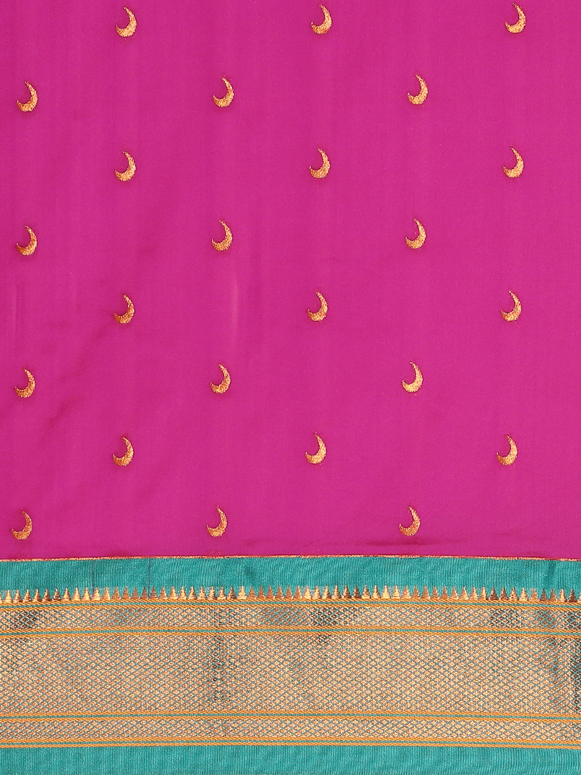 Explore The Collection Of Beautifully Designed Magenta & Rama Soft Silk Chandrakor Paithani Saree From Varkala Silk Sarees On Amazon. Indulge In Timeless Elegance With Our Soft Silk Chandrakor Paithani Saree. Its Intricate Checks Design Border Adds A Touch Of Sophistication, While The Copper Zari Chandraakor (Half Moon) Motif Butti Adorning The Body Exudes Grace. The Copper Zari Woven Peacock Motifs Pallu Enhances Its Allure, Making It Perfect For Weddings, Parties, And Festivals. Comes With An Unstitched Blouse Piece For Customization. Elevate Your Style With This Exquisite Piece Of Artistry.