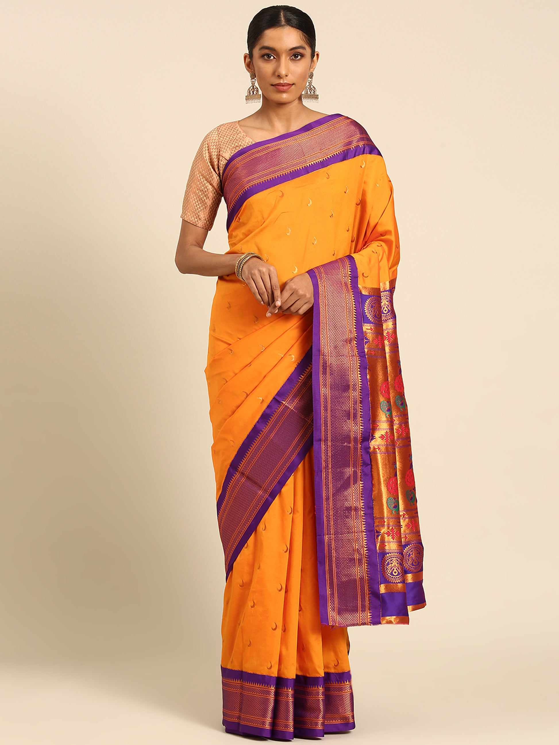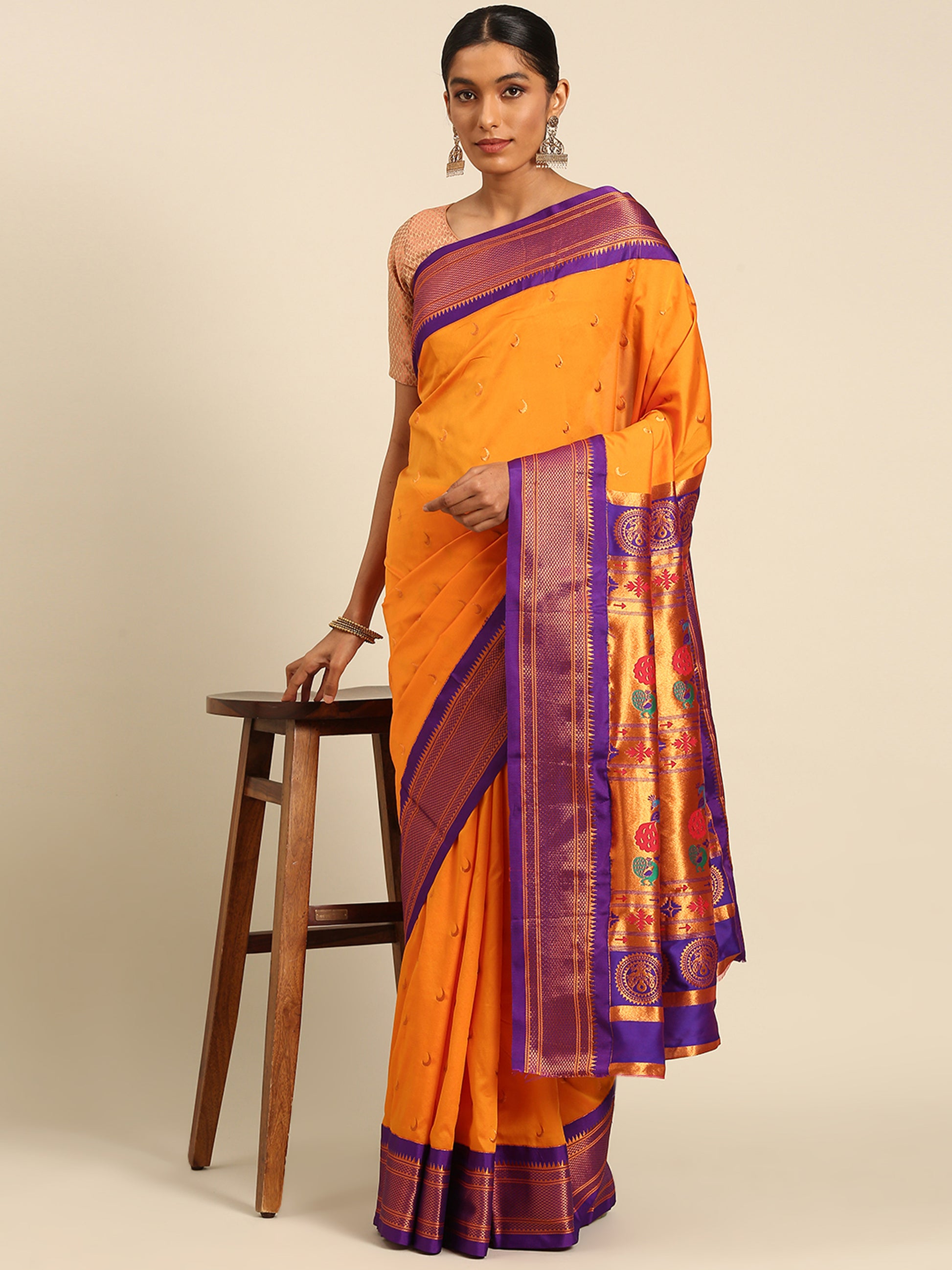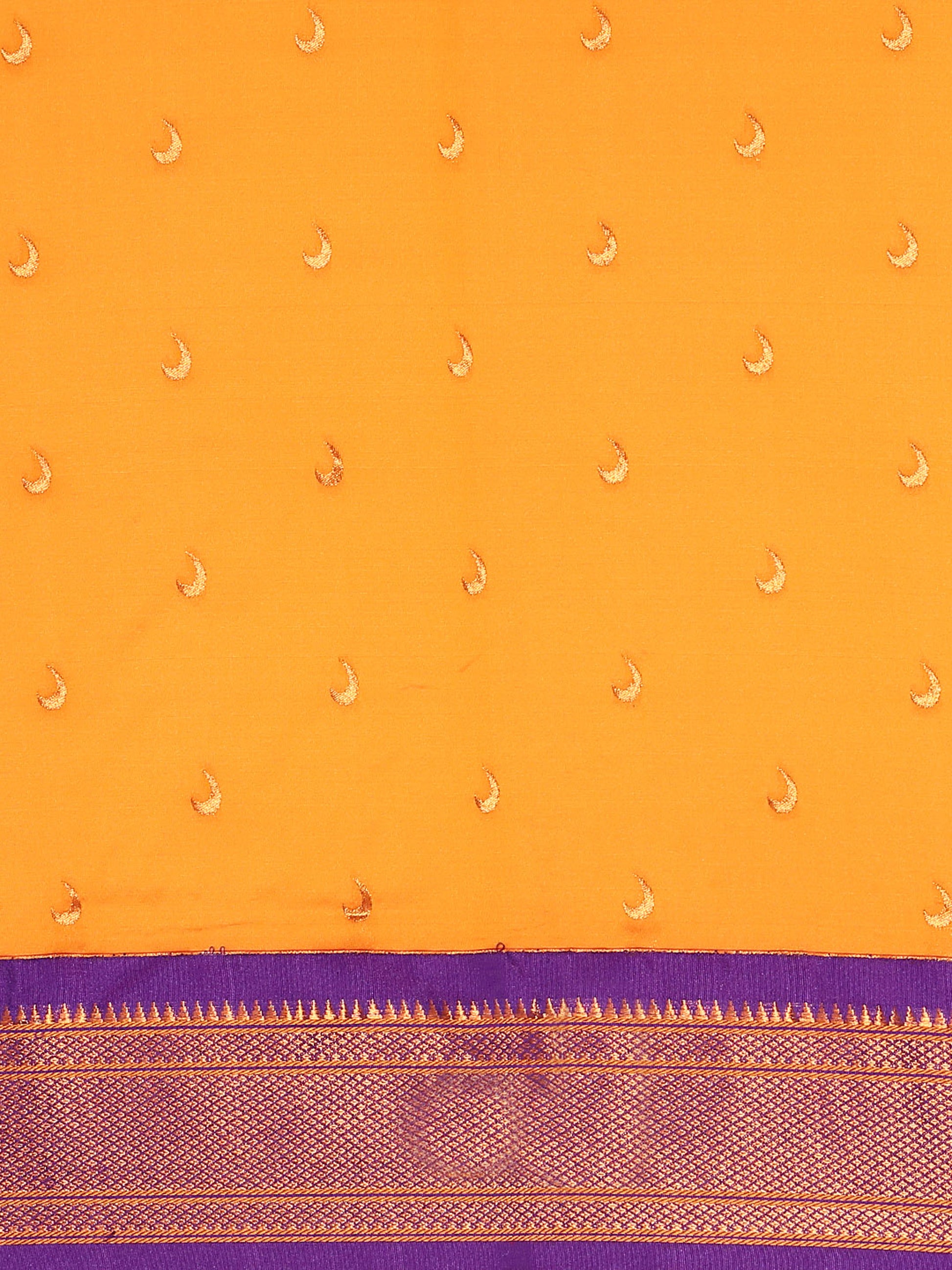 Explore The Collection Of Beautifully Designed Orange & Violet Soft Silk Chandrakor Paithani Saree From Varkala Silk Sarees. Indulge In Timeless Elegance With Our Soft Silk Chandrakor Paithani Saree. Its Intricate Checks Design Border Adds A Touch Of Sophistication, While The Copper Zari Chandraakor (Half Moon) Motif Butti Adorning The Body Exudes Grace. The Copper Zari Woven Peacock Motifs Pallu Enhances Its Allure, Making It Perfect For Weddings, Parties, And Festivals. Comes With An Unstitched Blouse Piece For Customization. Elevate Your Style With This Exquisite Piece Of Artistry.